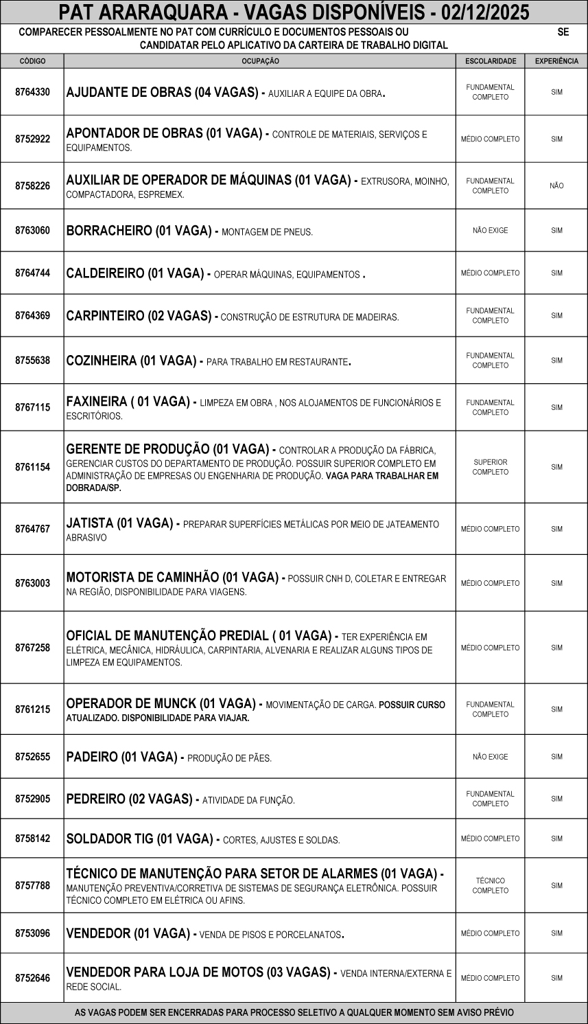 O município, em parceria com governo do Estado de São Paulo, realiza a intermediação entre empresas que oferecem vagas para trabalhos e trabalhadores em busca de emprego. O PAT também faz a habilitação ao Seguro-Desemprego e oferece orientações sobre a emissão da carteira de trabalho virtual. O PAT Araraquara conta com a divulgação de suas vagas nas redes sociais, facilitando o envio de currículos dos candidatos que não possuem condições de acessar presencialmente o serviço.