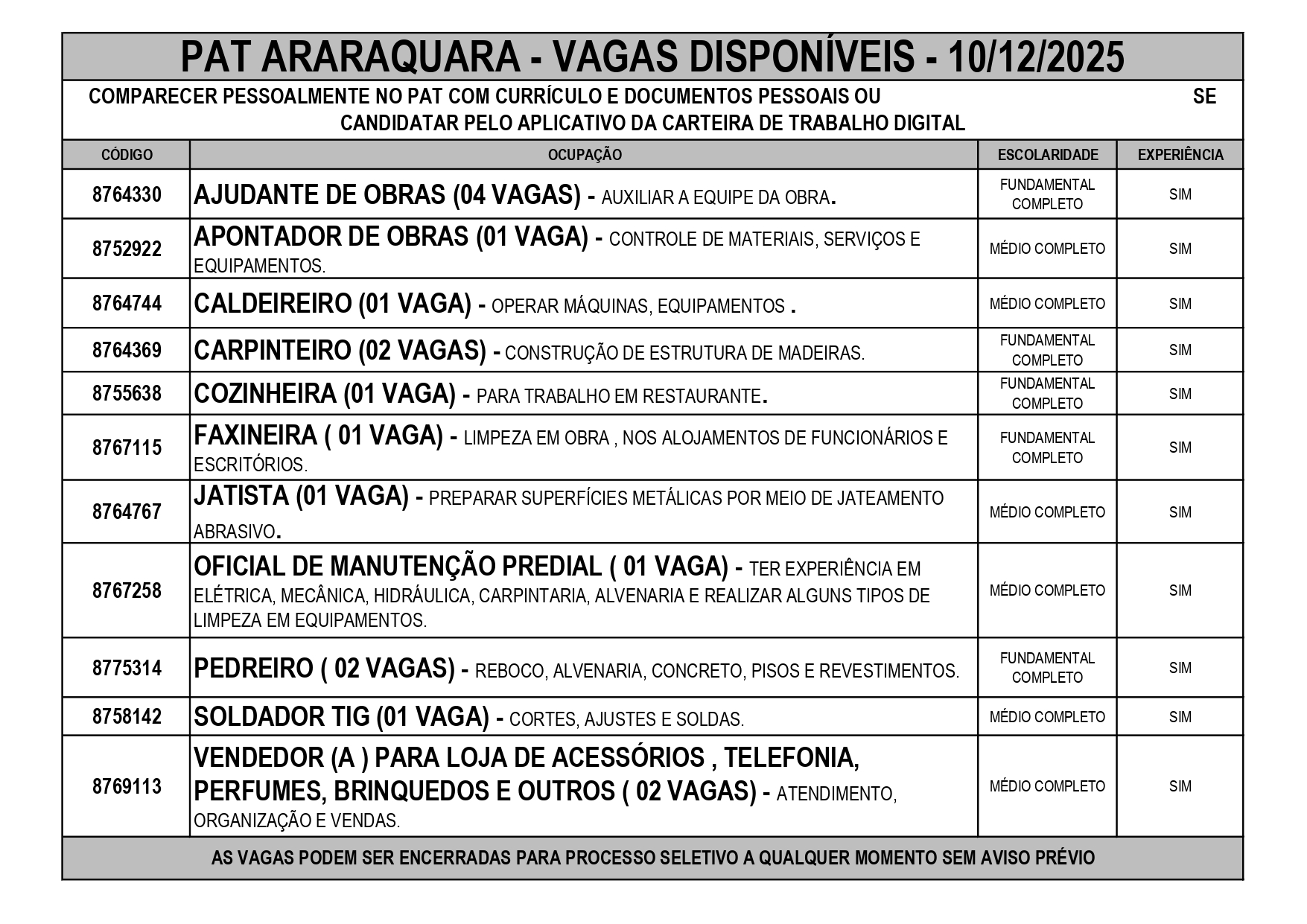Comparecer pessoalmente no PAT com currículo e documentos pessoais ou se candidatar pelo aplicativo da carteira de trabalho digital. Com o app da Carteira de Trabalho Digital, o candidato encontra as melhores vagas e se candidata com apenas alguns toques!