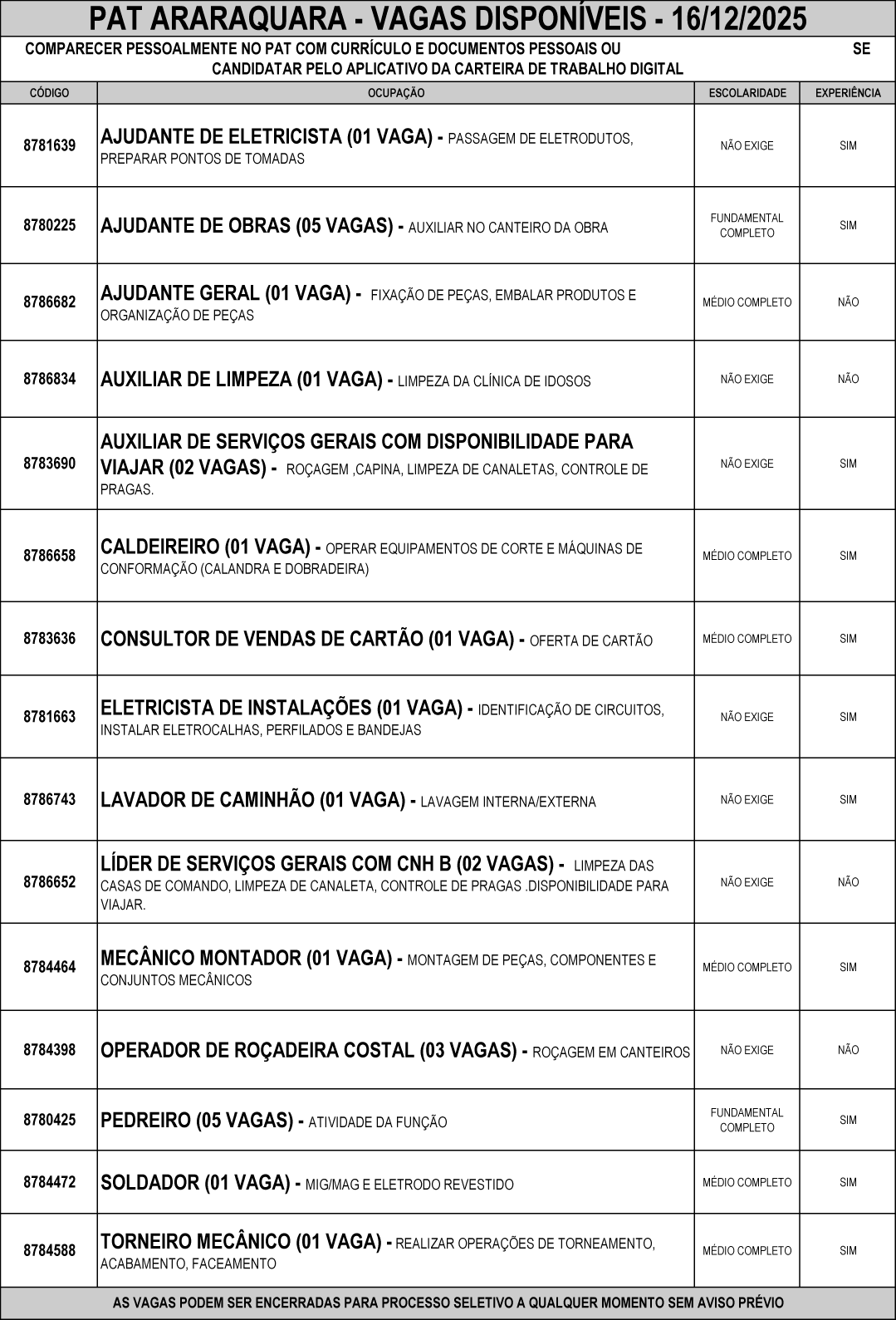 Confira as vagas de emprego disponíveis no PAT de Araraquara