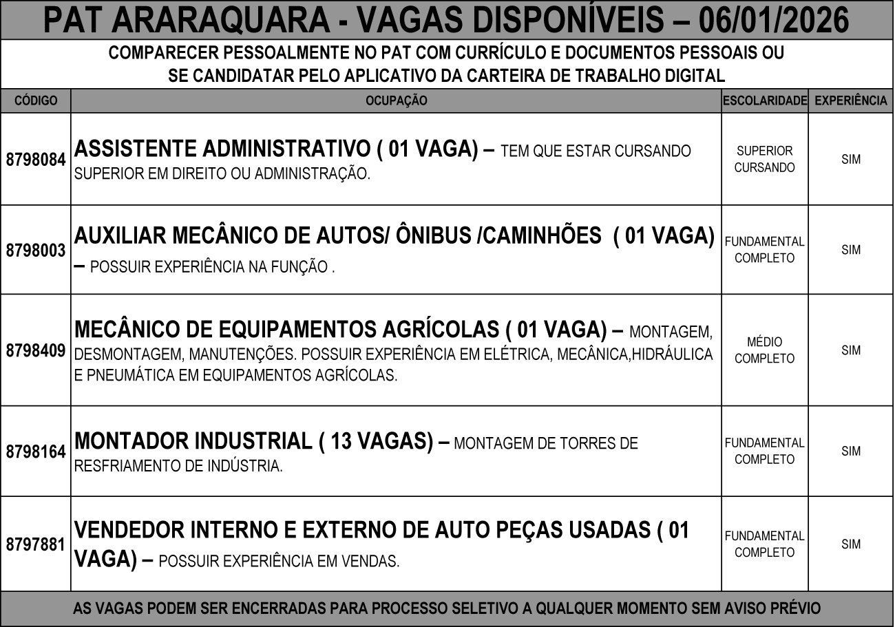 Confira as vagas de emprego disponíveis no PAT de Araraquara