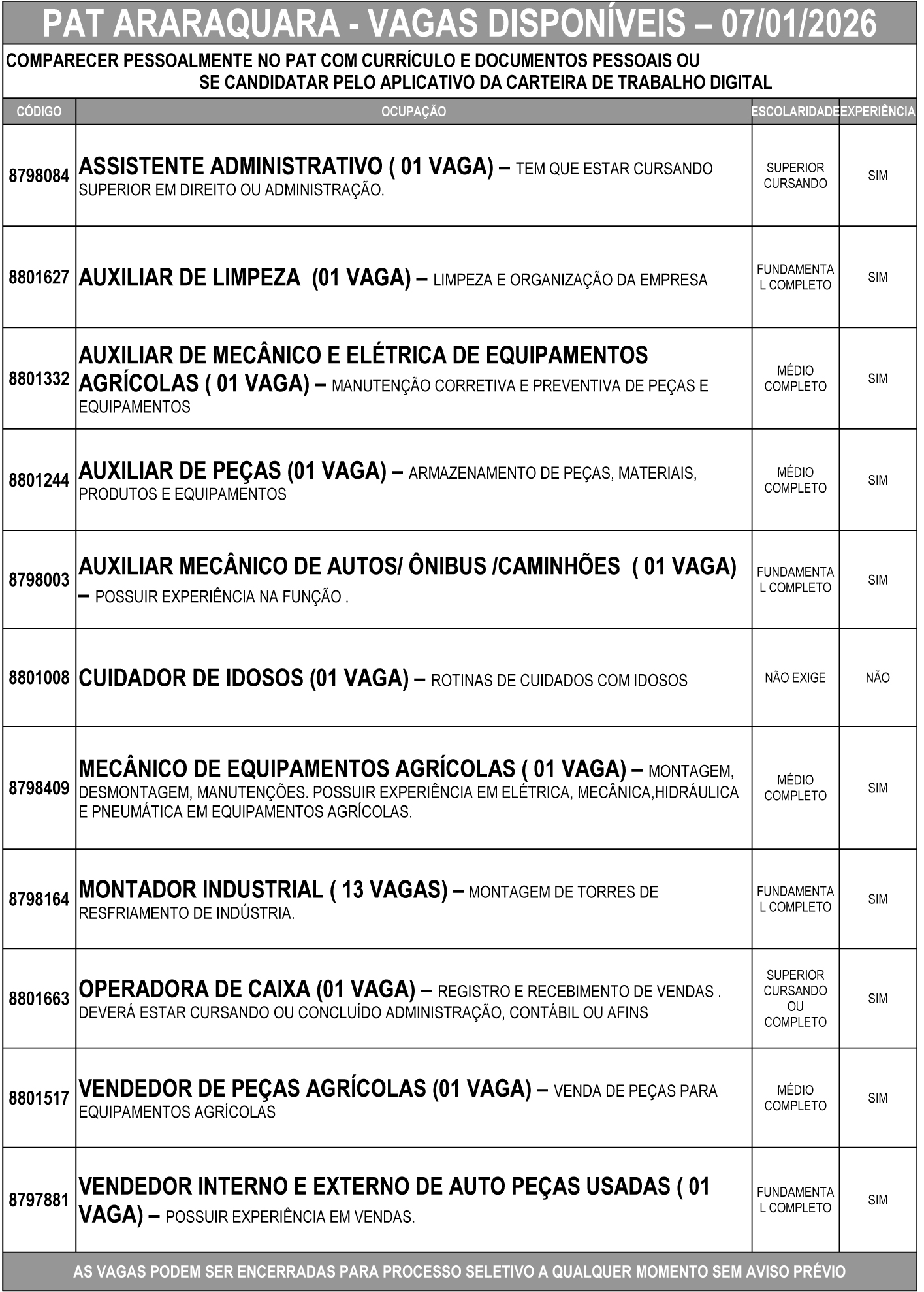 Confira as vagas de emprego disponíveis no PAT de Araraquara