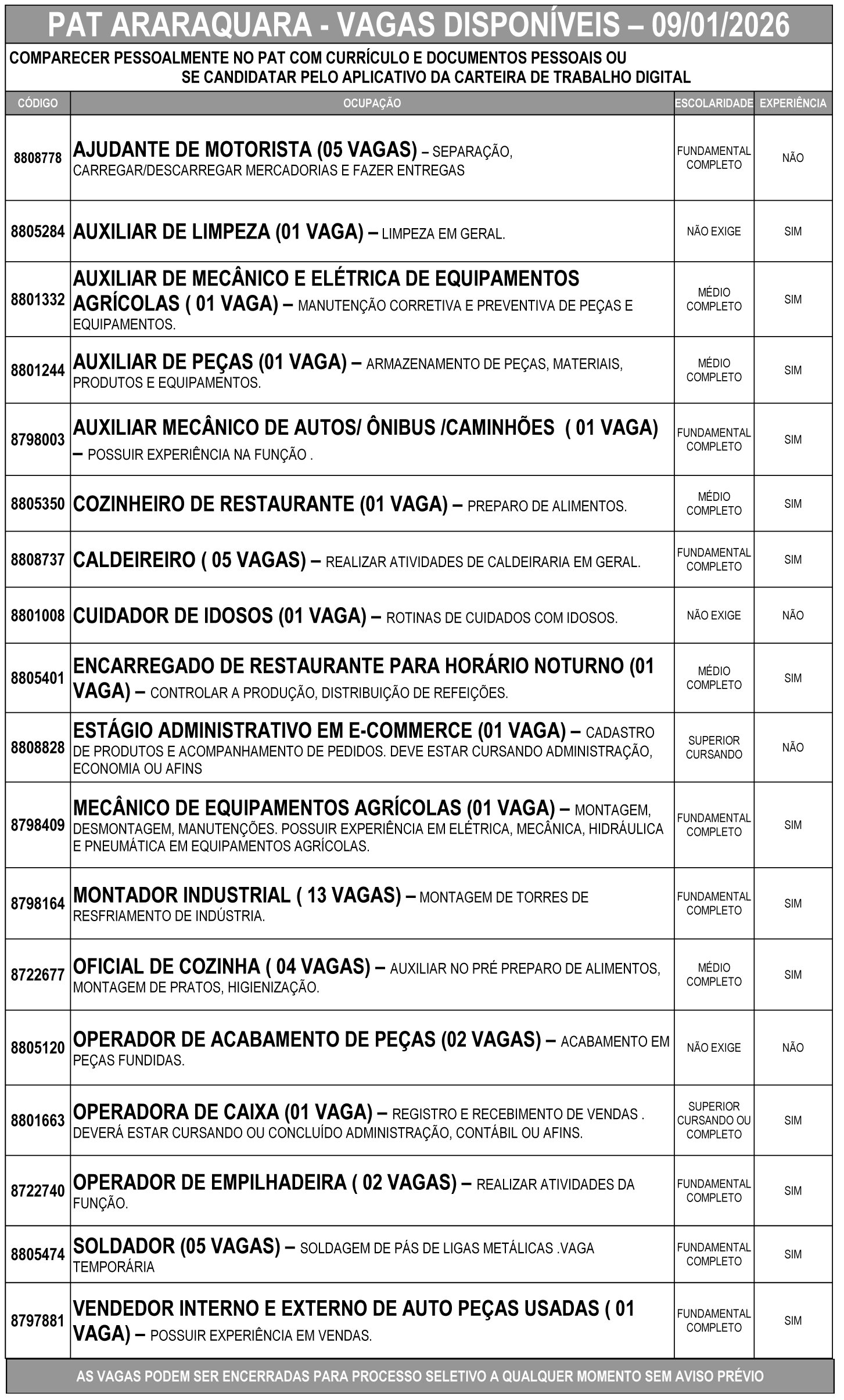 Confira as vagas de emprego disponíveis no PAT de Araraquara
