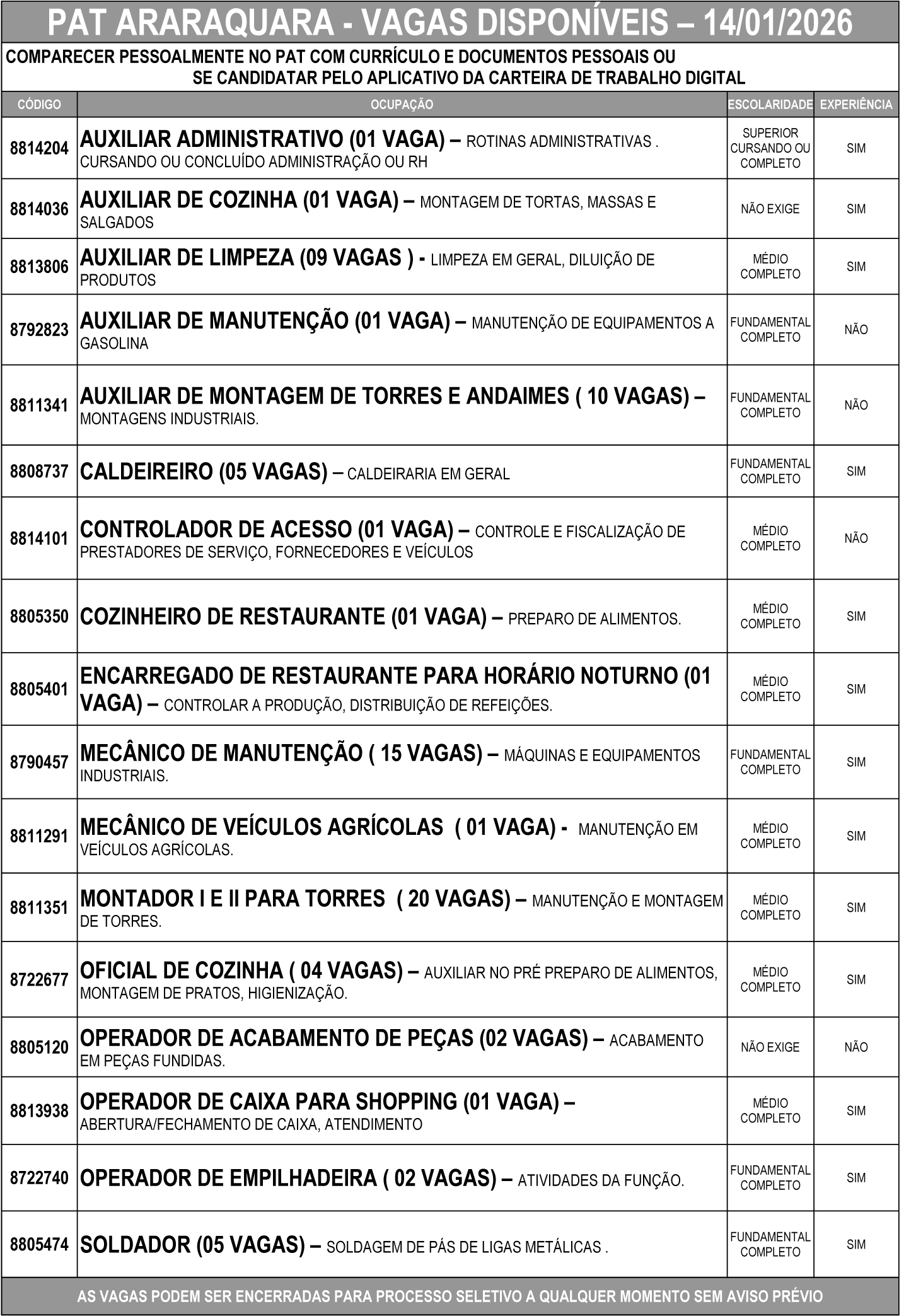 Confira as vagas de emprego disponíveis no PAT de Araraquara