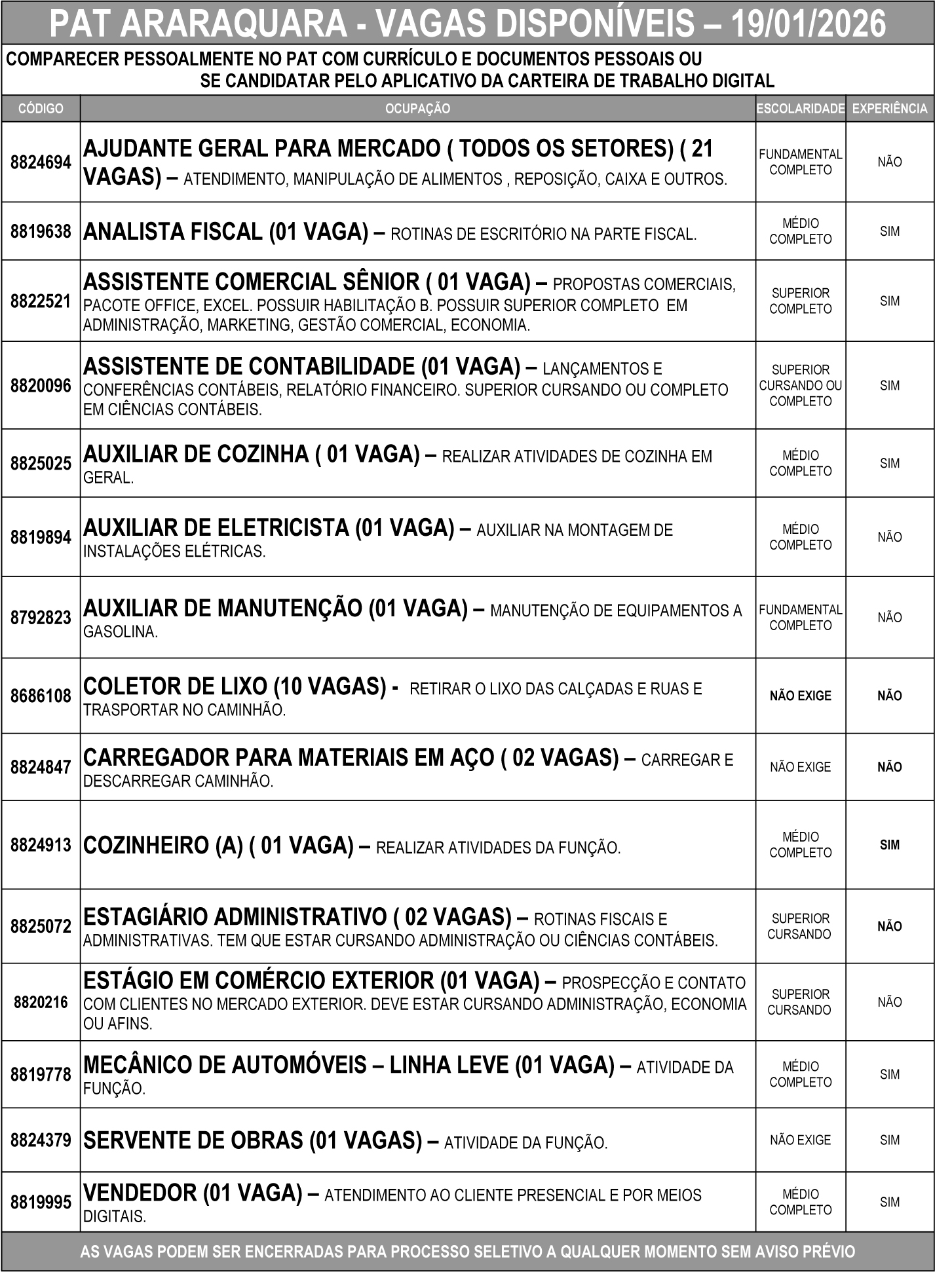 Confira as vagas de emprego disponíveis no PAT de Araraquara