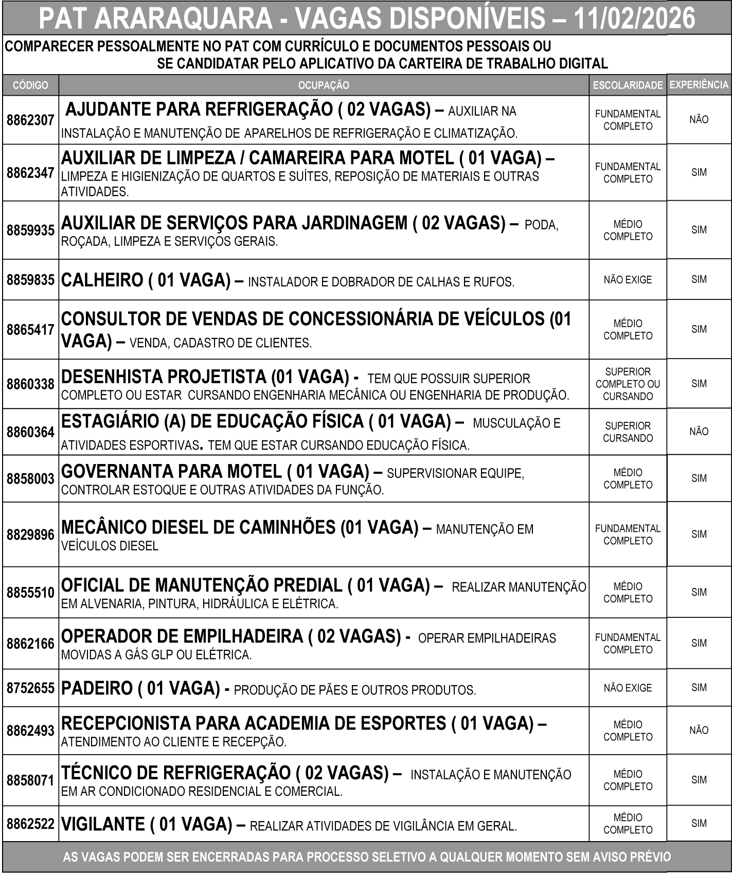 Confira as vagas de emprego disponíveis no PAT de Araraquara