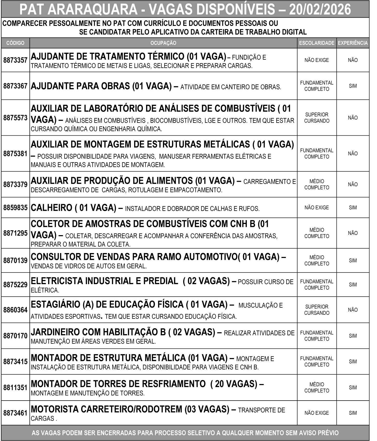 O município, em parceria com governo do Estado de São Paulo, realiza a intermediação entre empresas que oferecem vagas para trabalhos e trabalhadores em busca de emprego. O PAT também faz a habilitação ao Seguro-Desemprego e oferece orientações sobre a emissão da carteira de trabalho virtual. O PAT Araraquara conta com a divulgação de suas vagas nas redes sociais, facilitando o envio de currículos dos candidatos que não possuem condições de acessar presencialmente o serviço.