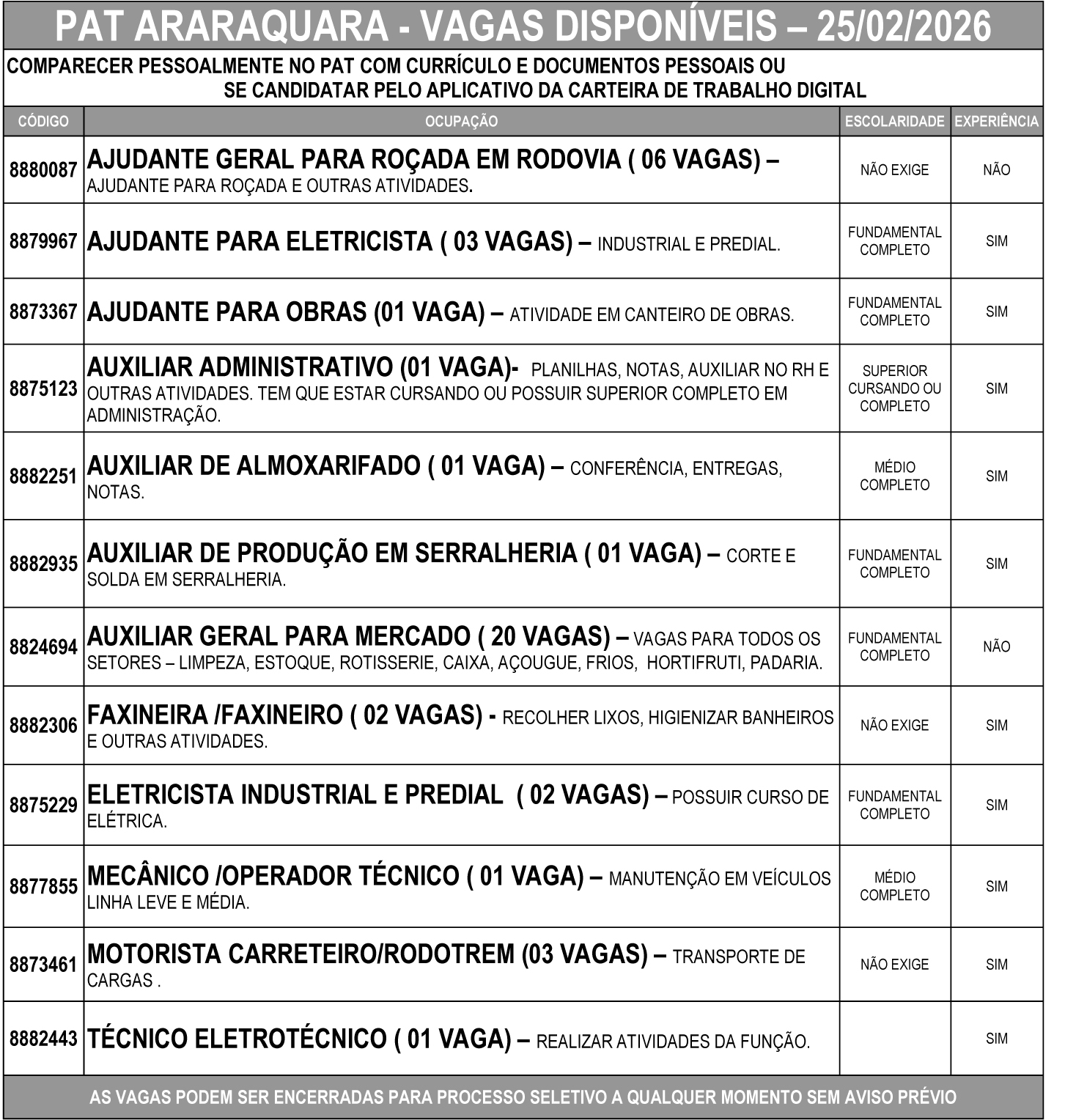As vagas podem ser encerradas a qualquer momento para início de processo seletivo, sem aviso prévio.