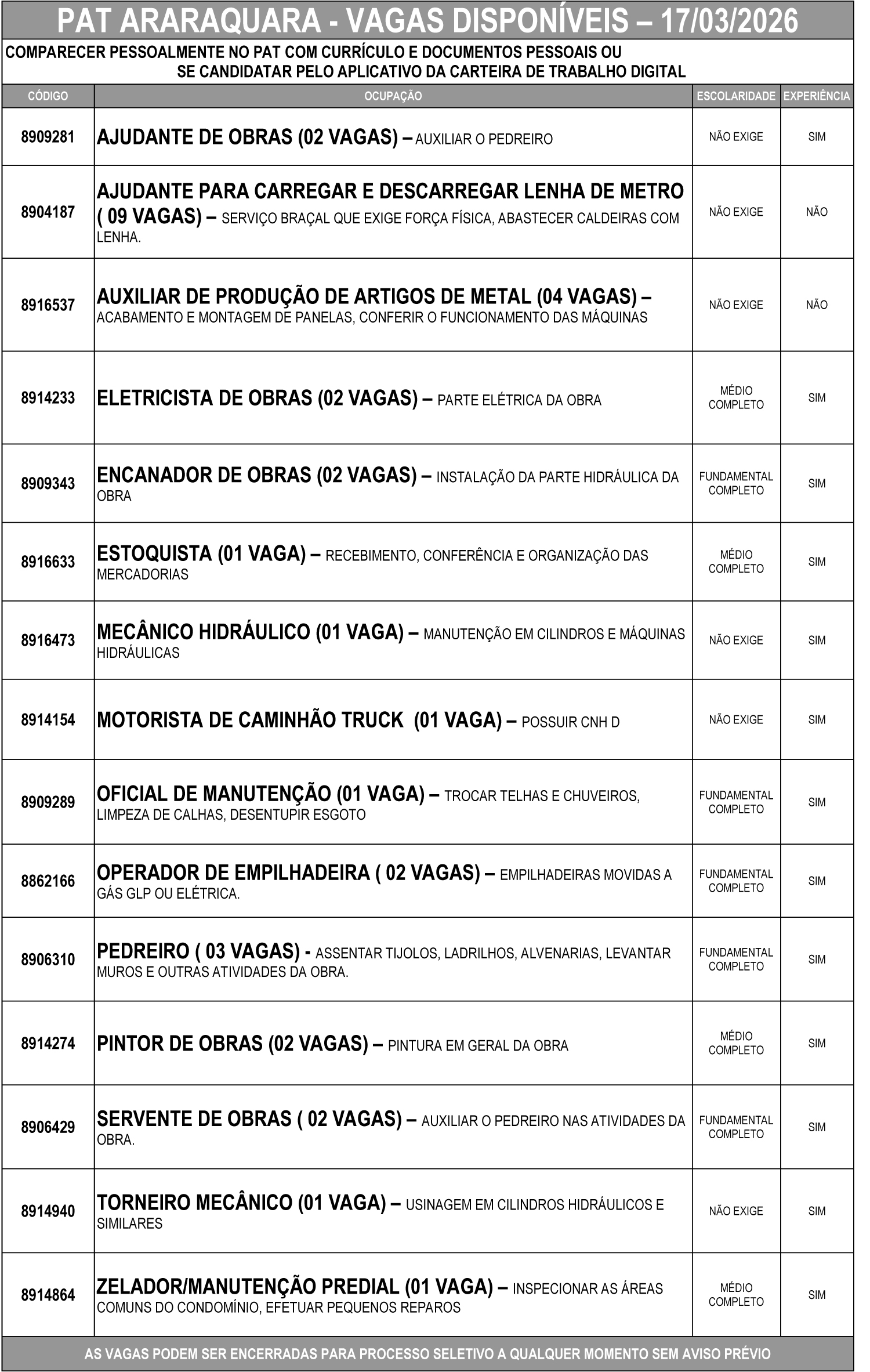 🏢 Presencialmente, comparecendo ao PAT com currículo e documentos pessoais;
