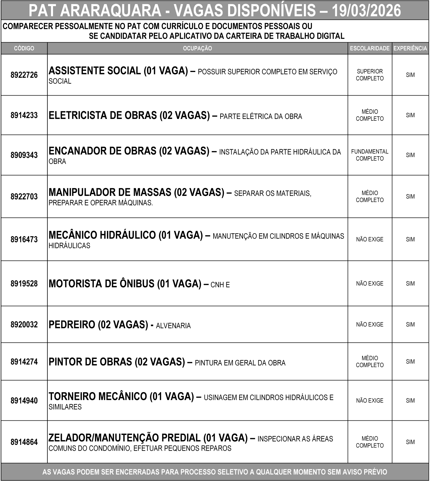 🏢 Presencialmente, comparecendo ao PAT com currículo e documentos pessoais;