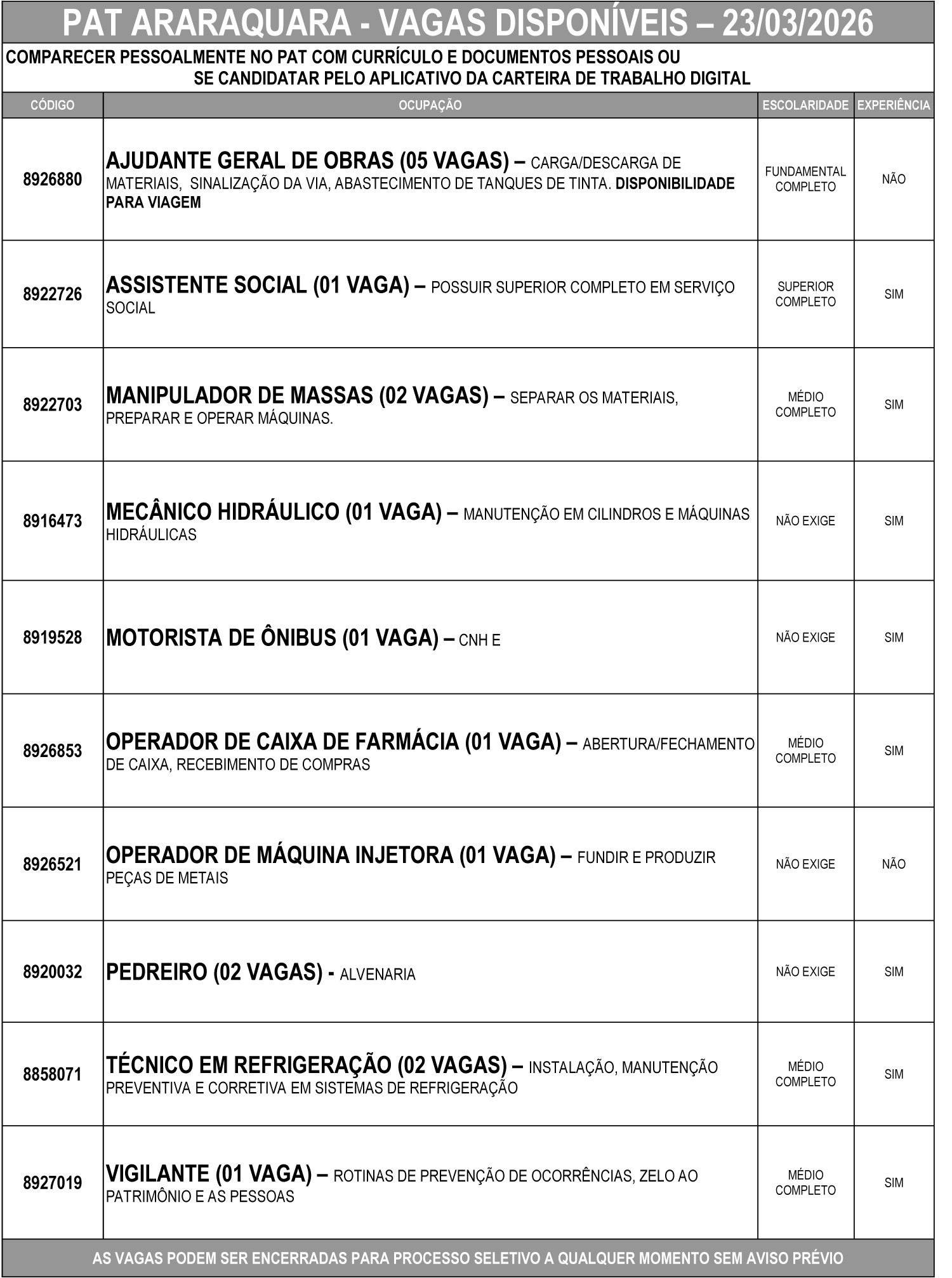 As vagas podem ser encerradas a qualquer momento para início de processo seletivo, sem aviso prévio.