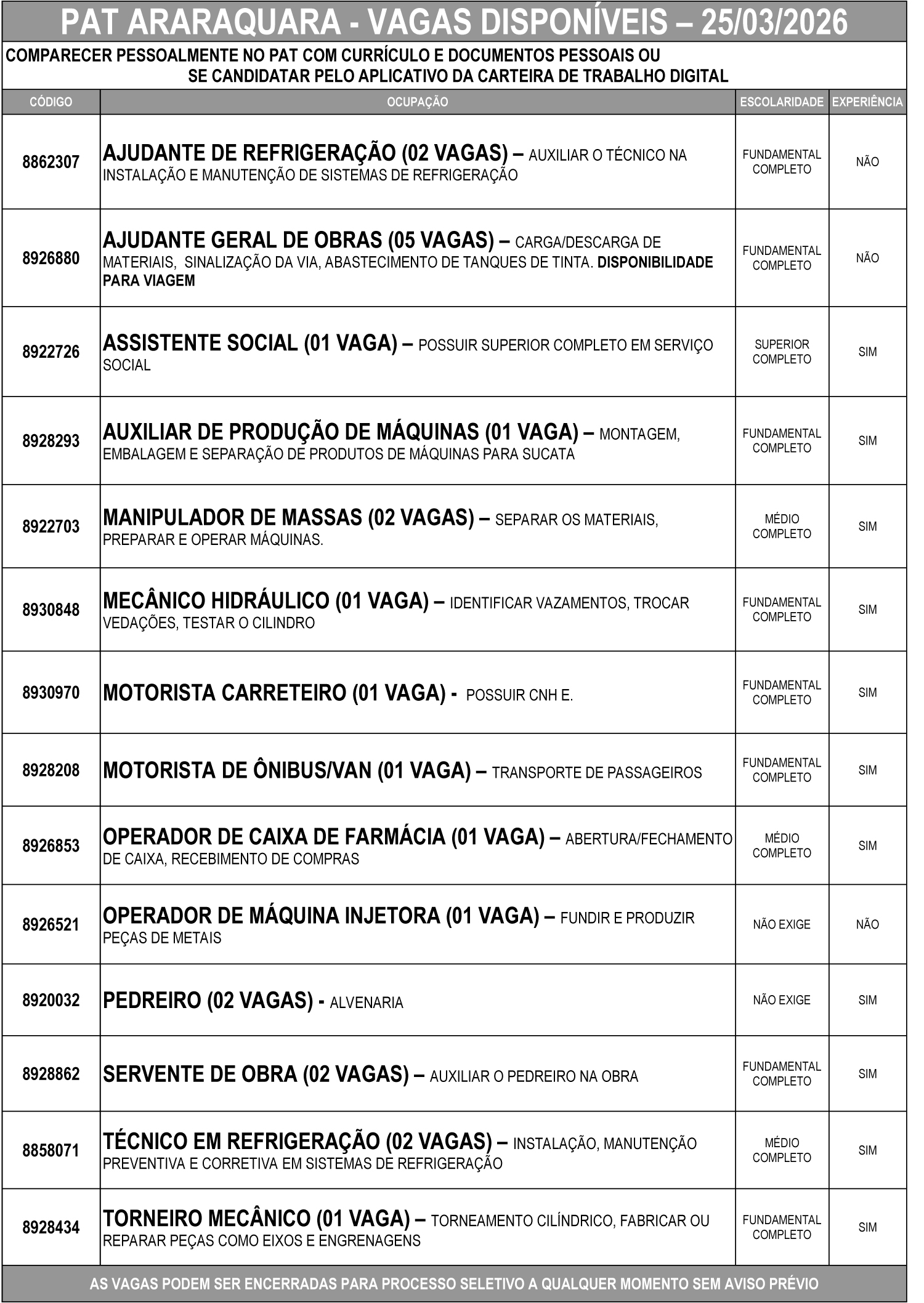 As vagas podem ser encerradas a qualquer momento para início de processo seletivo, sem aviso prévio.