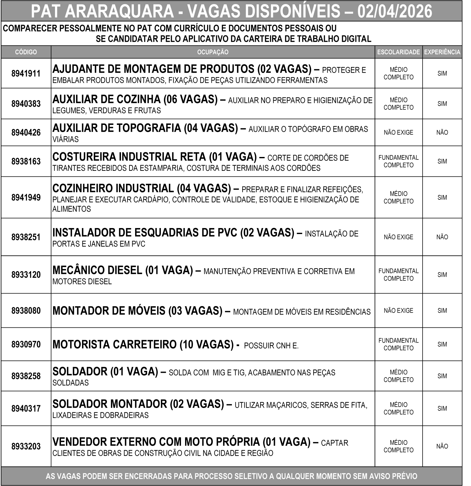 As vagas podem ser encerradas a qualquer momento para início de processo seletivo, sem aviso prévio.