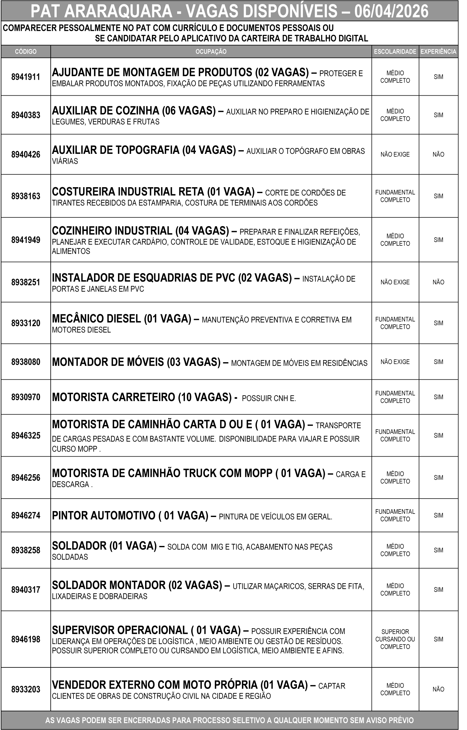 As vagas podem ser encerradas a qualquer momento para início de processo seletivo, sem aviso prévio.