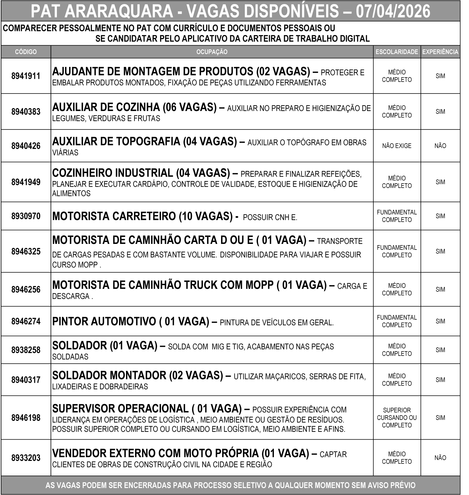 As vagas podem ser encerradas a qualquer momento para início de processo seletivo, sem aviso prévio.