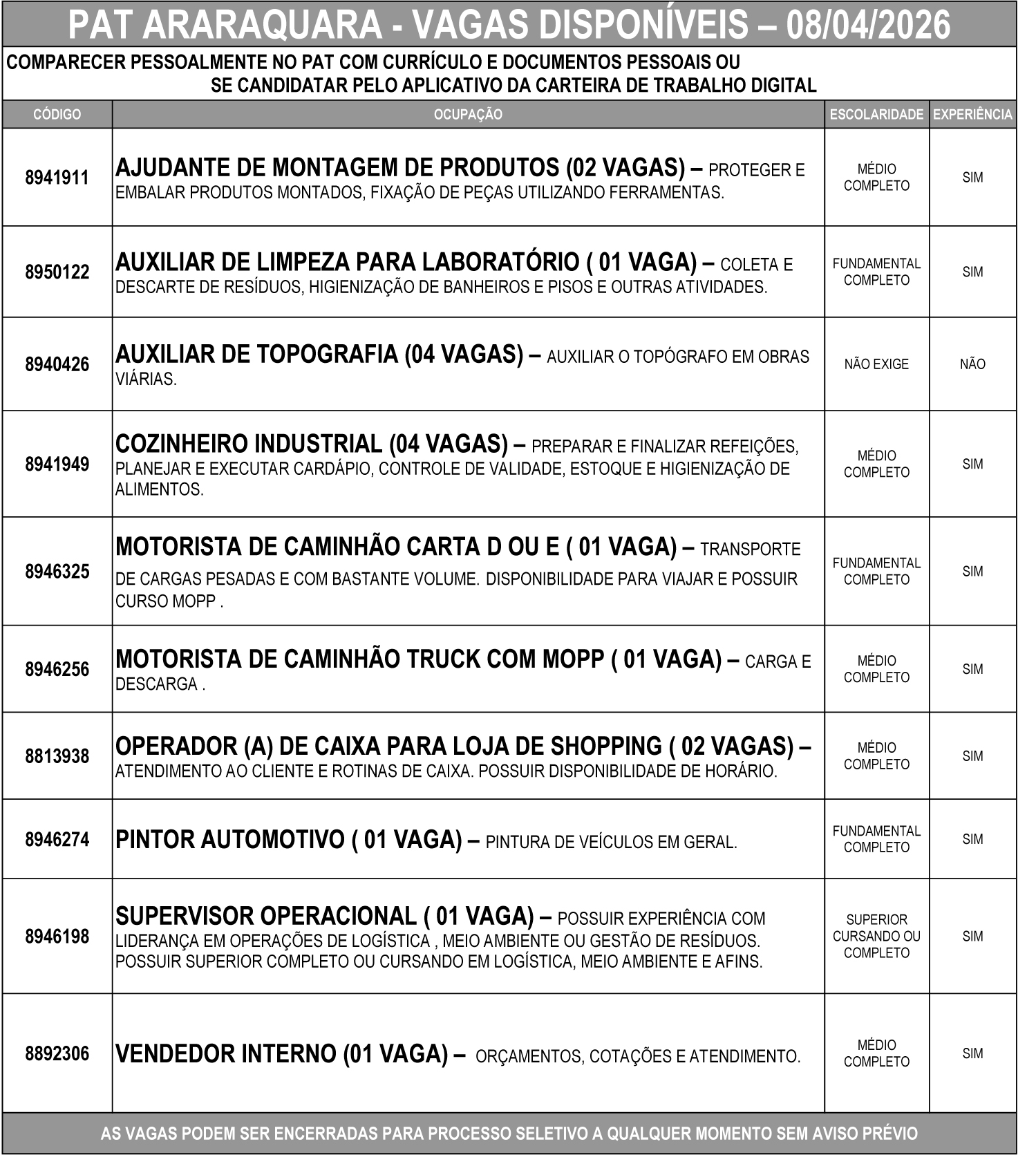 As vagas podem ser encerradas a qualquer momento para início de processo seletivo, sem aviso prévio.