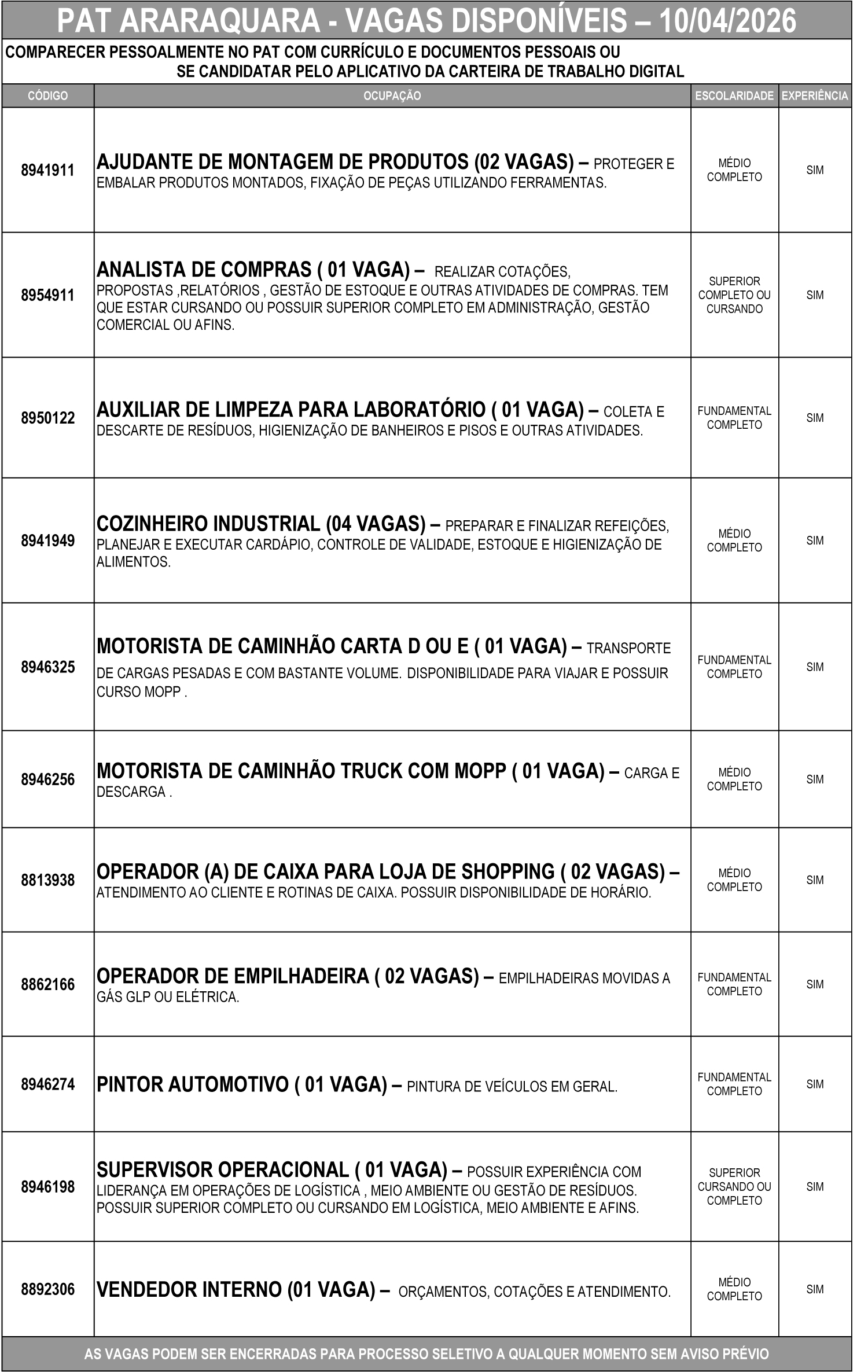 As vagas podem ser encerradas a qualquer momento para início de processo seletivo, sem aviso prévio.