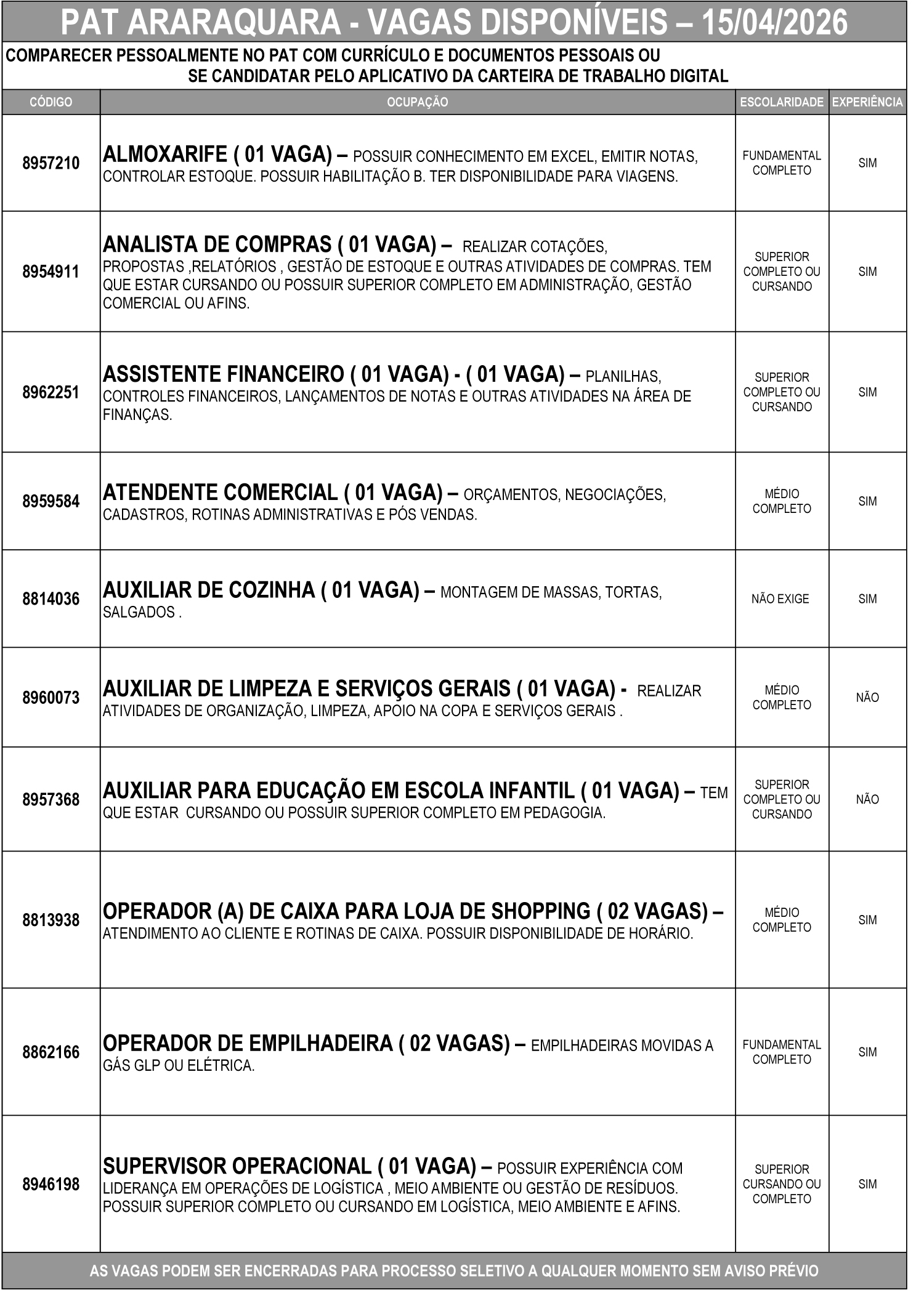 As vagas podem ser encerradas a qualquer momento para início de processo seletivo, sem aviso prévio.