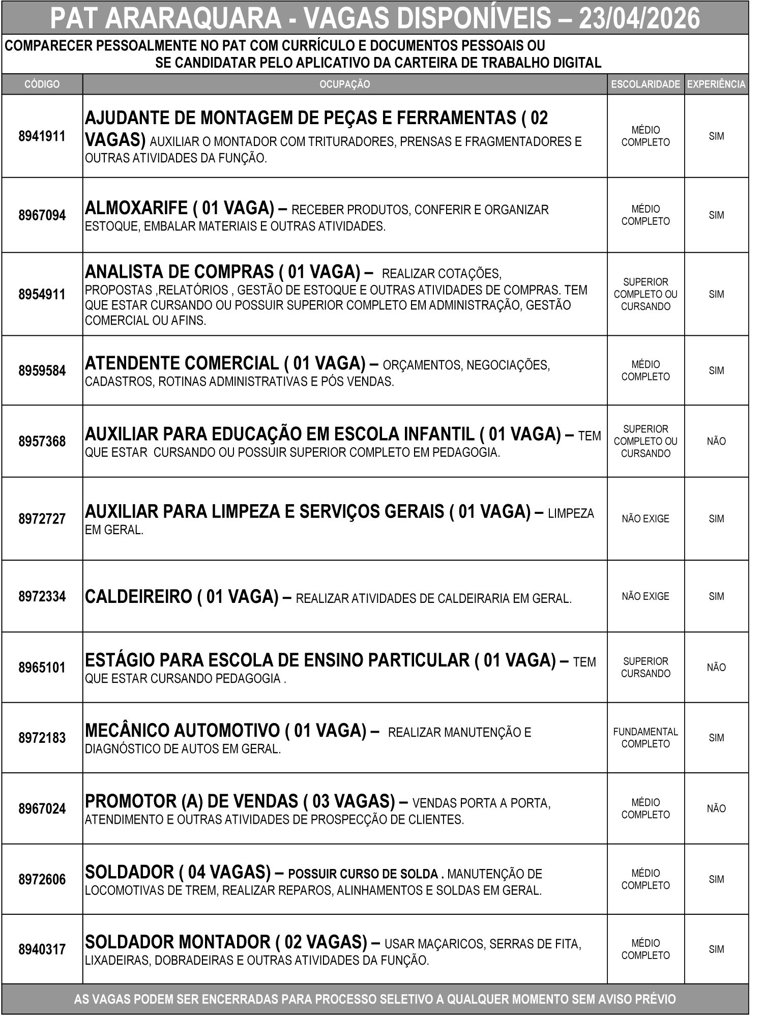 As vagas podem ser encerradas a qualquer momento para início de processo seletivo, sem aviso prévio.