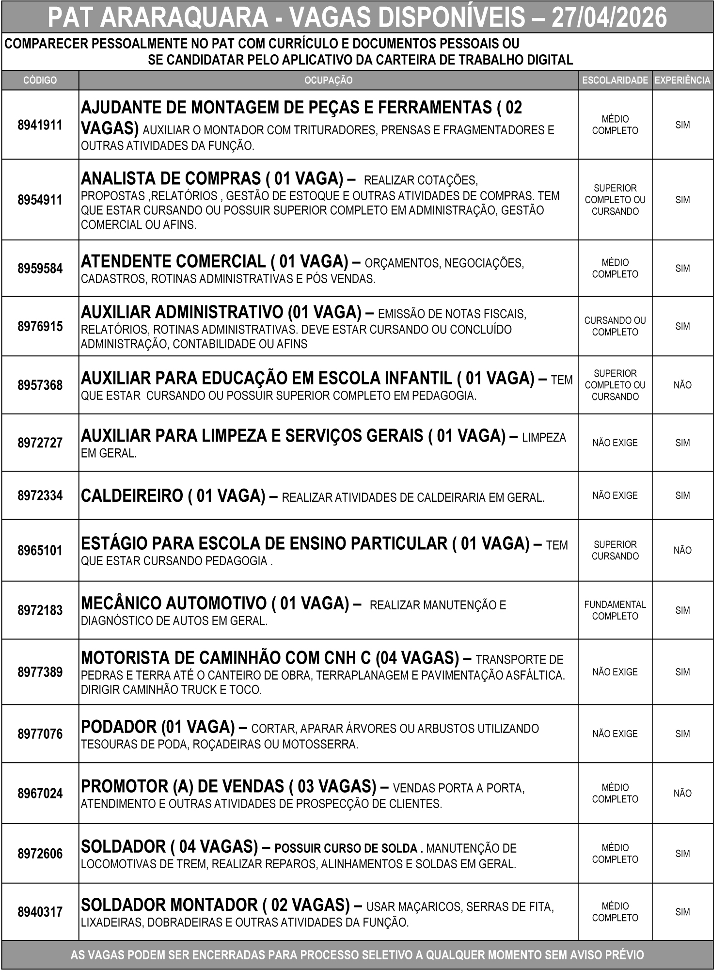 🏢 Presencialmente, comparecendo ao PAT com currículo e documentos pessoais;