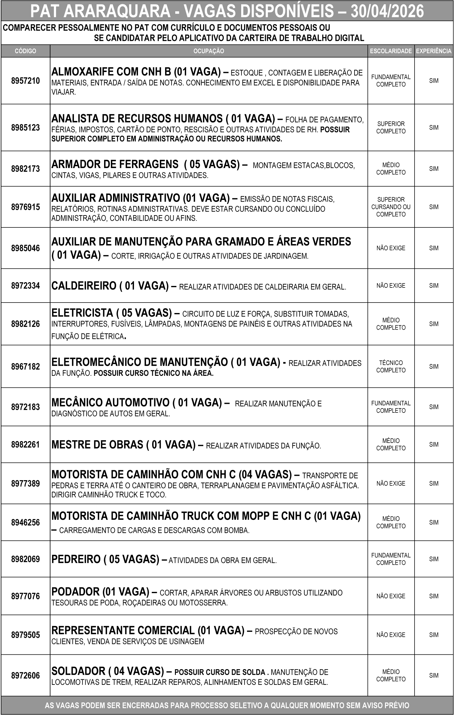As vagas podem ser encerradas a qualquer momento para início de processo seletivo, sem aviso prévio.