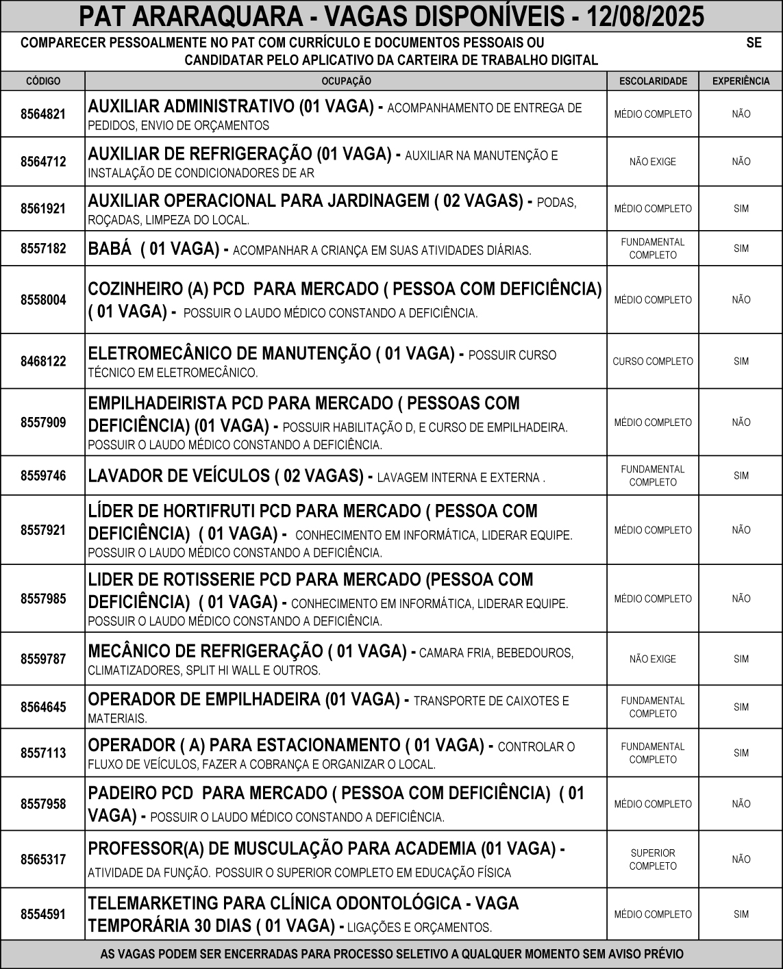 Confira as vagas de emprego disponíveis no PAT de Araraquara