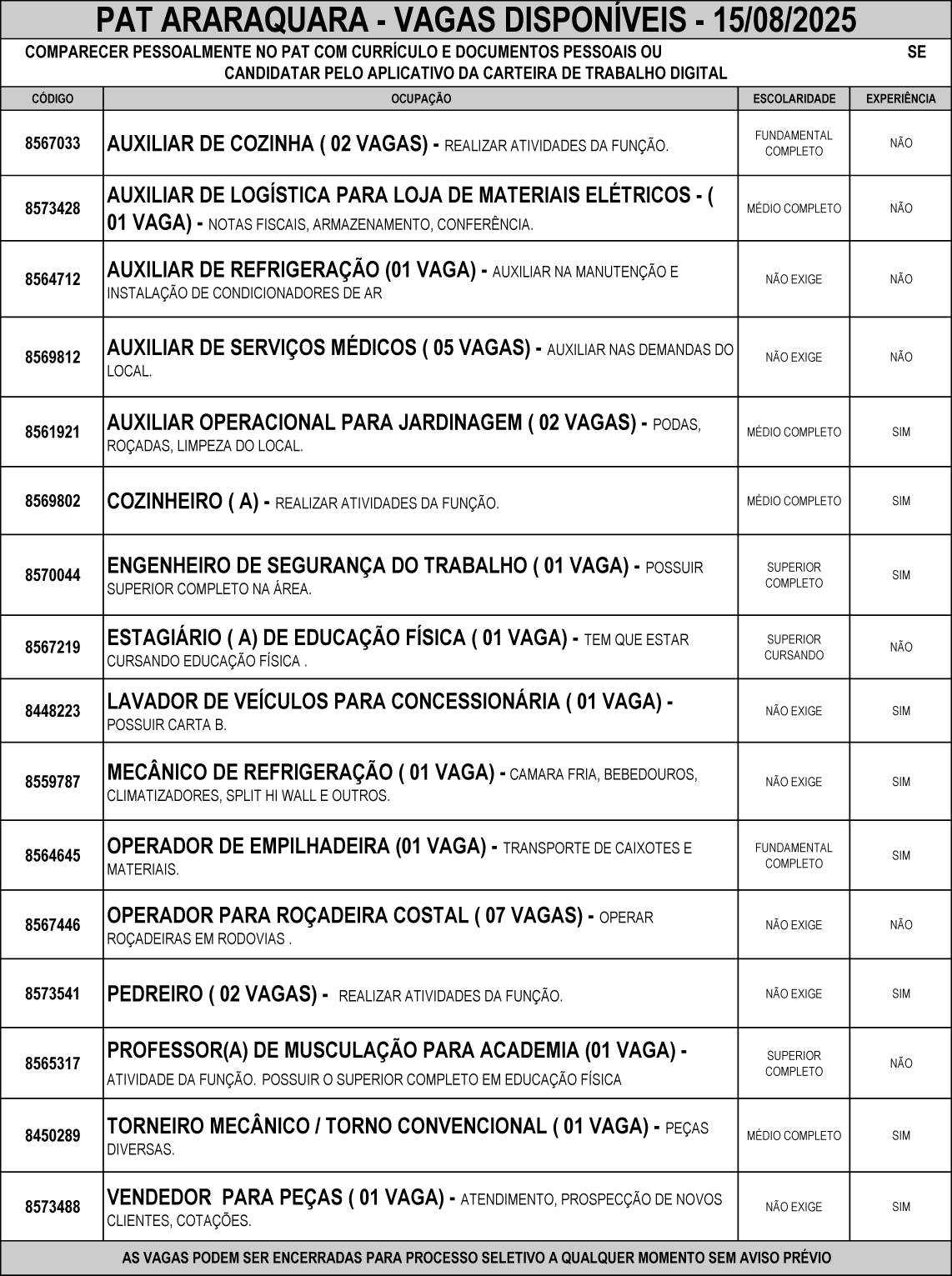 Confira as vagas de emprego disponíveis no PAT de Araraquara