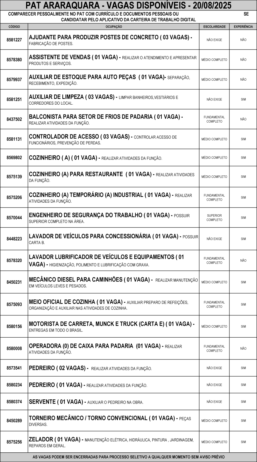 Confira as vagas de emprego disponíveis no PAT de Araraquara