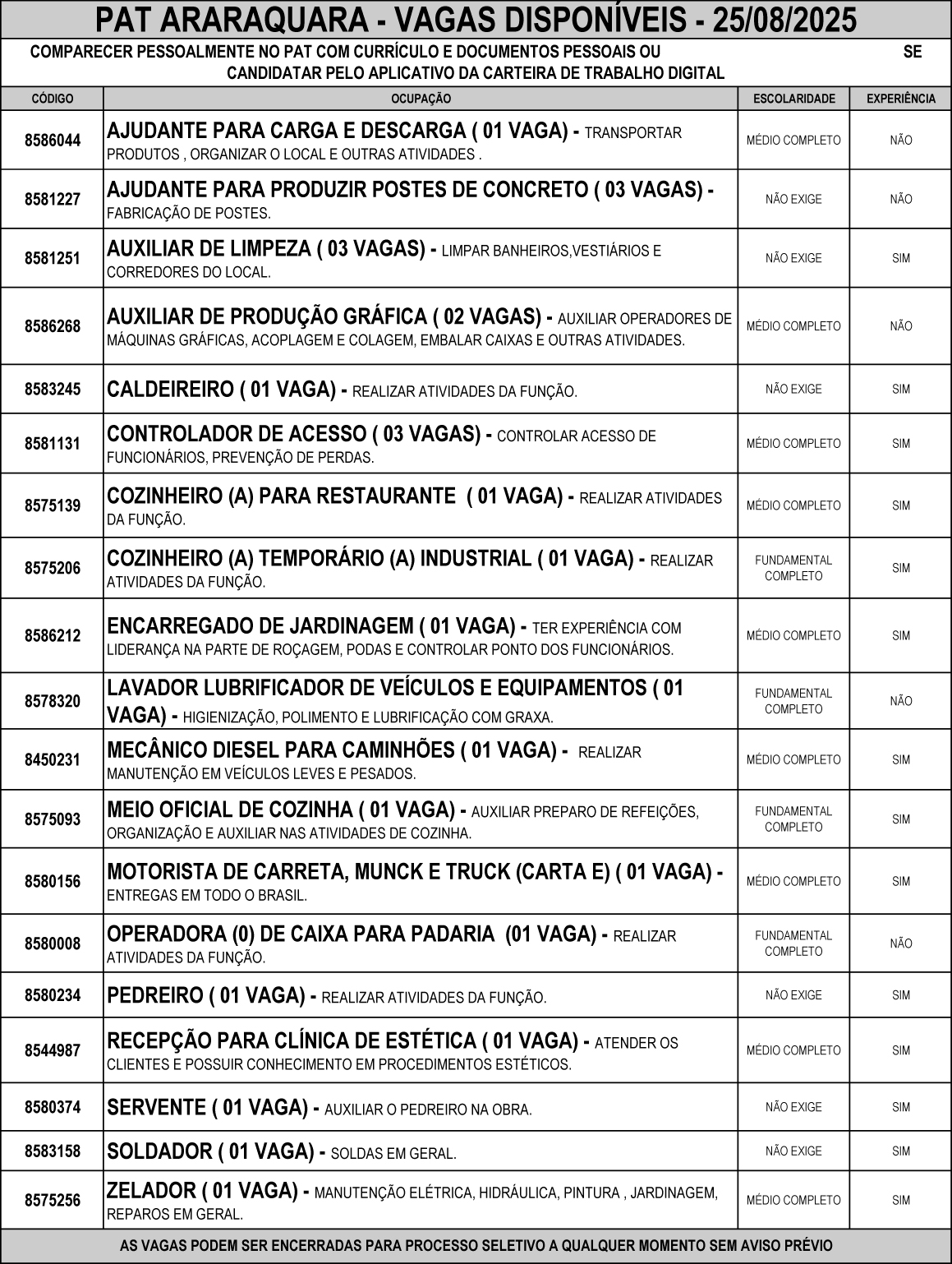 Confira as vagas de emprego disponíveis no PAT de Araraquara
