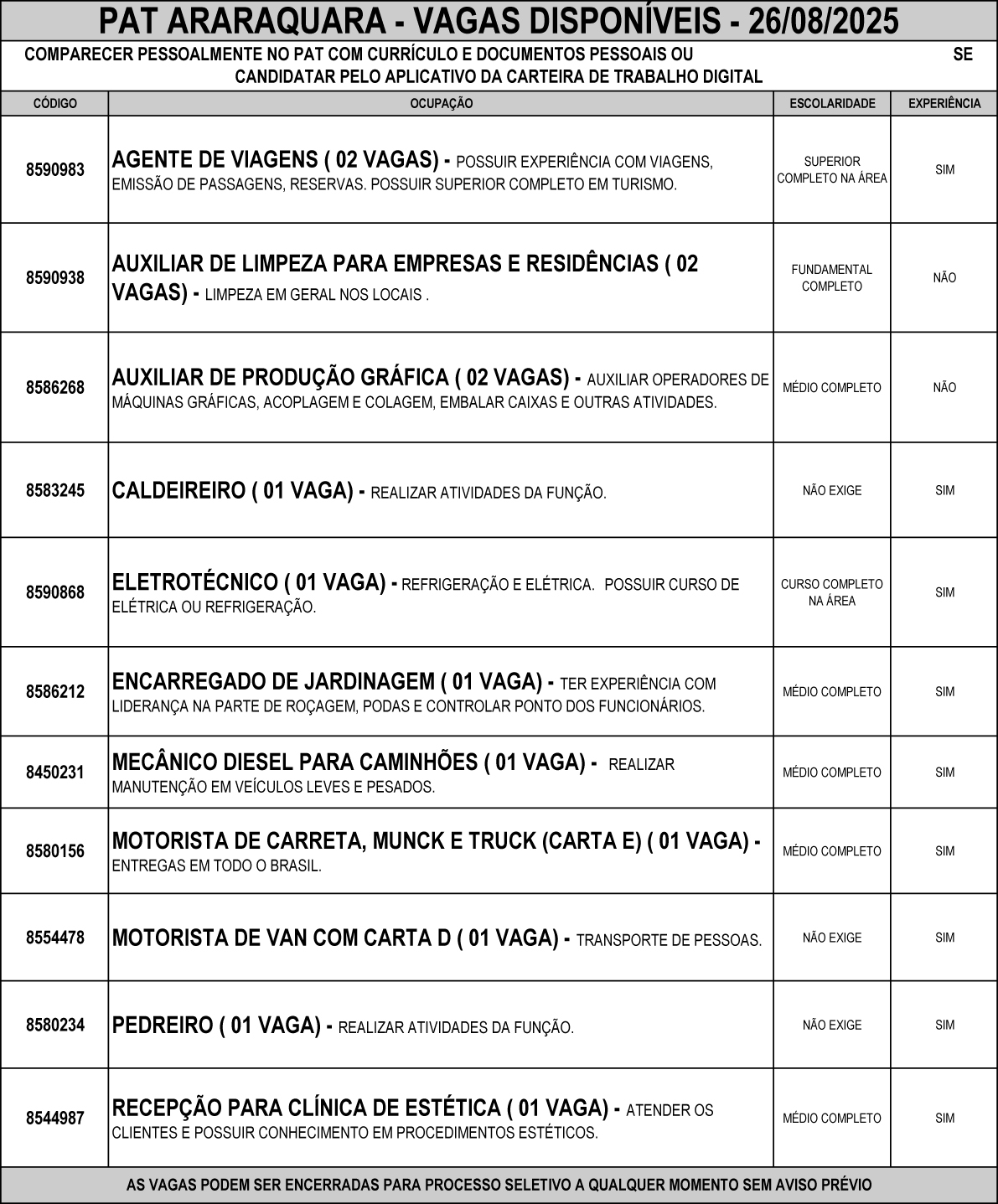 Confira as vagas de emprego disponíveis no PAT de Araraquara