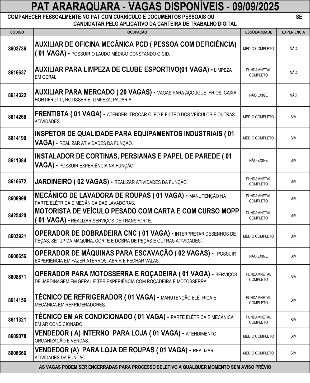 Confira as vagas de emprego disponíveis no PAT de Araraquara