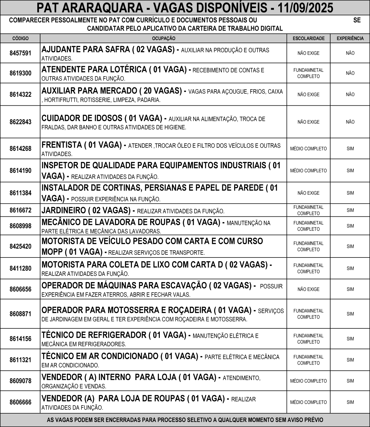 Confira as vagas de emprego disponíveis no PAT de Araraquara