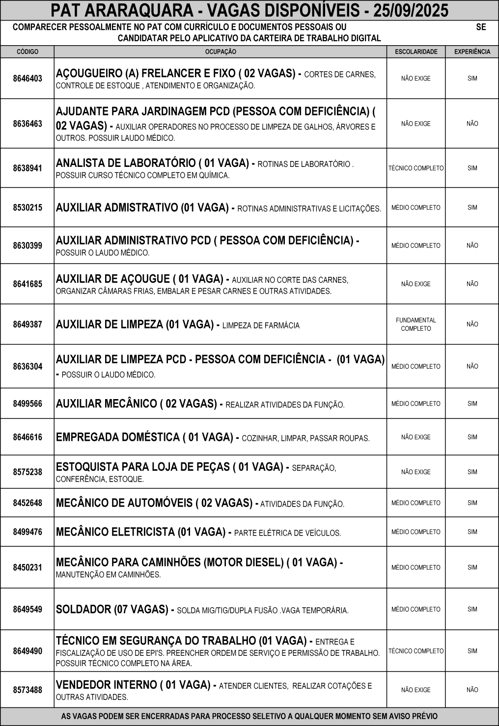 Confira as vagas de emprego disponíveis no PAT de Araraquara