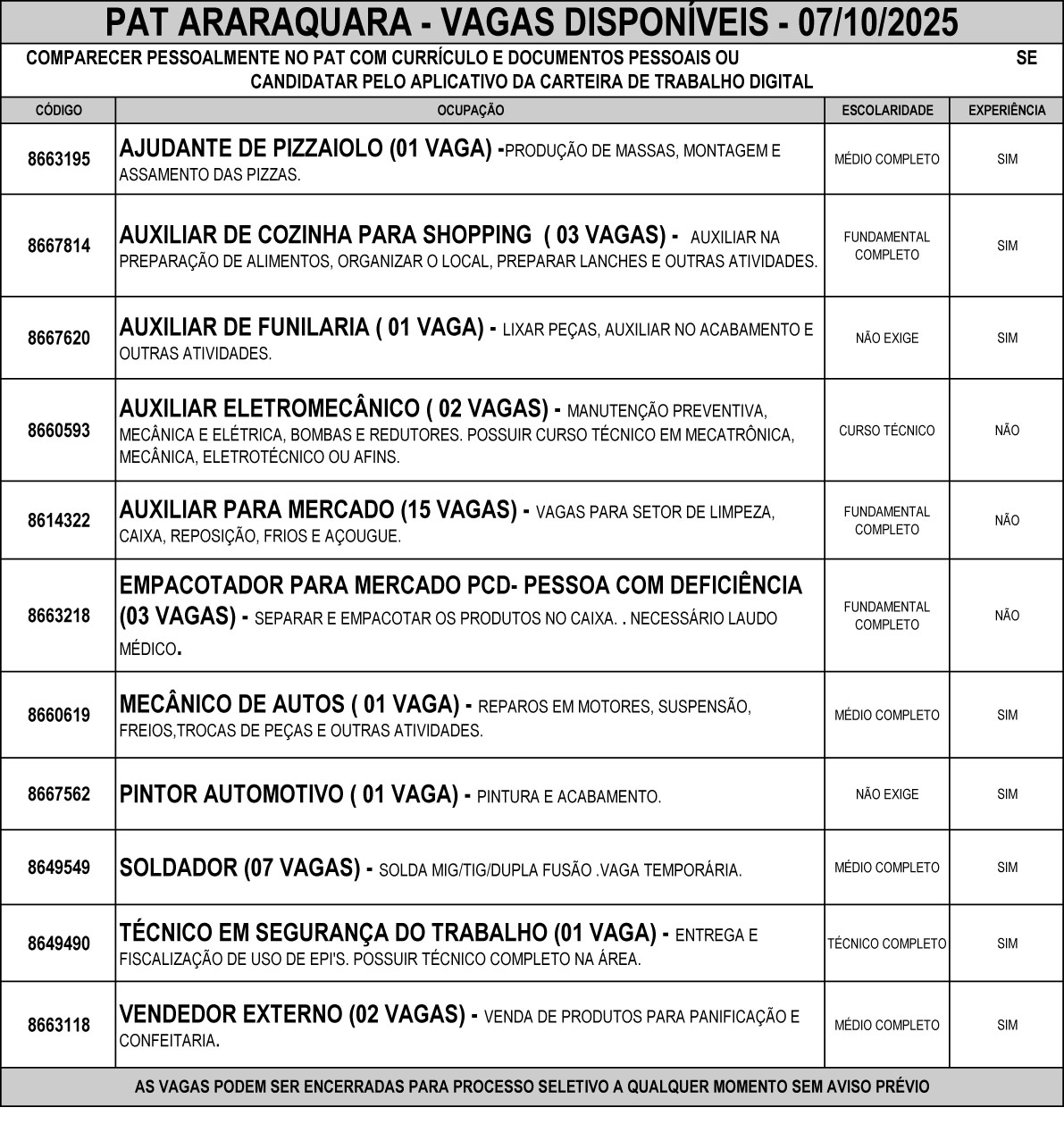 O município, em parceria com governo do Estado de São Paulo, realiza a intermediação entre empresas que oferecem vagas para trabalhos e trabalhadores em busca de emprego. O PAT também faz a habilitação ao Seguro-Desemprego e oferece orientações sobre a emissão da carteira de trabalho virtual. O PAT Araraquara conta com a divulgação de suas vagas nas redes sociais, facilitando o envio de currículos dos candidatos que não possuem condições de acessar presencialmente o serviço.