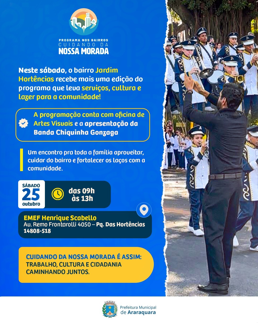 O programa “Cuidando da Nossa Morada” é uma iniciativa da Prefeitura de Araraquara que reúne secretarias municipais para levar atendimento direto aos bairros, com serviços gratuitos, orientações, atividades culturais e ações de cidadania. Durante o evento, a Secretaria Municipal de Cultura também realizará atendimentos relativos às Oficinas Culturais, com informações sobre datas, horários e locais e também inscrições para as oficinas com turmas abertas.