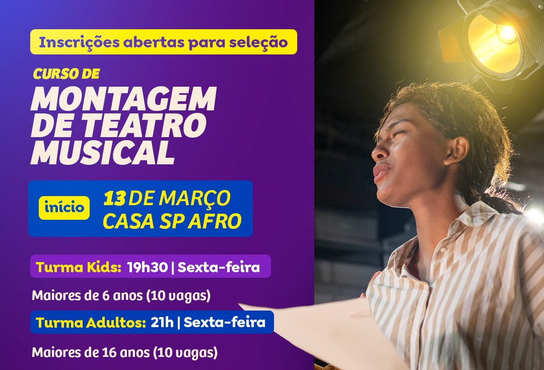 O curso “Montagem de Teatro Musical” ganha destaque na programação da Casa SP Afro, em uma parceria efetuada com o grupo 4i Artes e com o apoio da Secretaria Municipal de Direitos Humanos e Cidadania, por meio da Subsecretaria de Políticas Públicas Étnico Raciais. Com uma turma para crianças e outra para adultos, a atividade está com inscrições abertas até o próximo dia 6 de março.