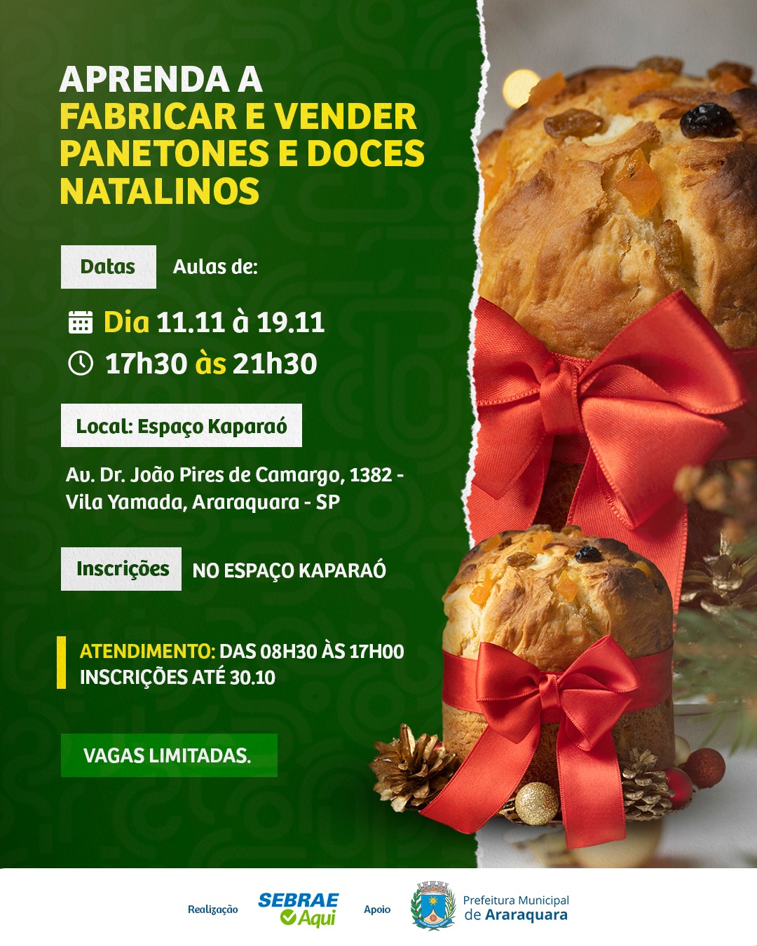 A Prefeitura de Araraquara, em parceria com o Sebrae, oferece em novembro dois cursos gratuitos voltados à qualificação profissional e ao fortalecimento do empreendedorismo: “Fabricação de Panetones e Doces Natalinos” e “Fabricação de Geleias, Compotas e Doces de Frutas”.