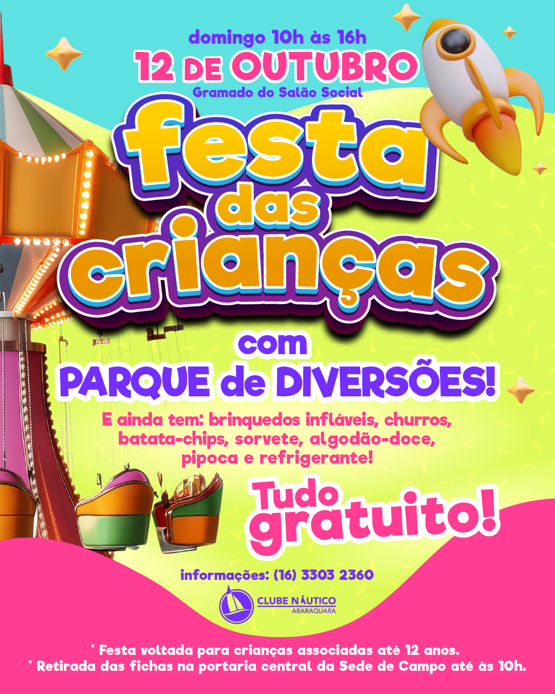 No dia 12 de outubro, a garotada nauticana vai viver um dia cheio de alegria e muita diversão! É a Festa das Crianças na sede de campo do Clube Náutico Araraquara!