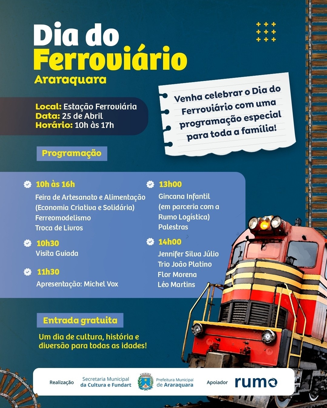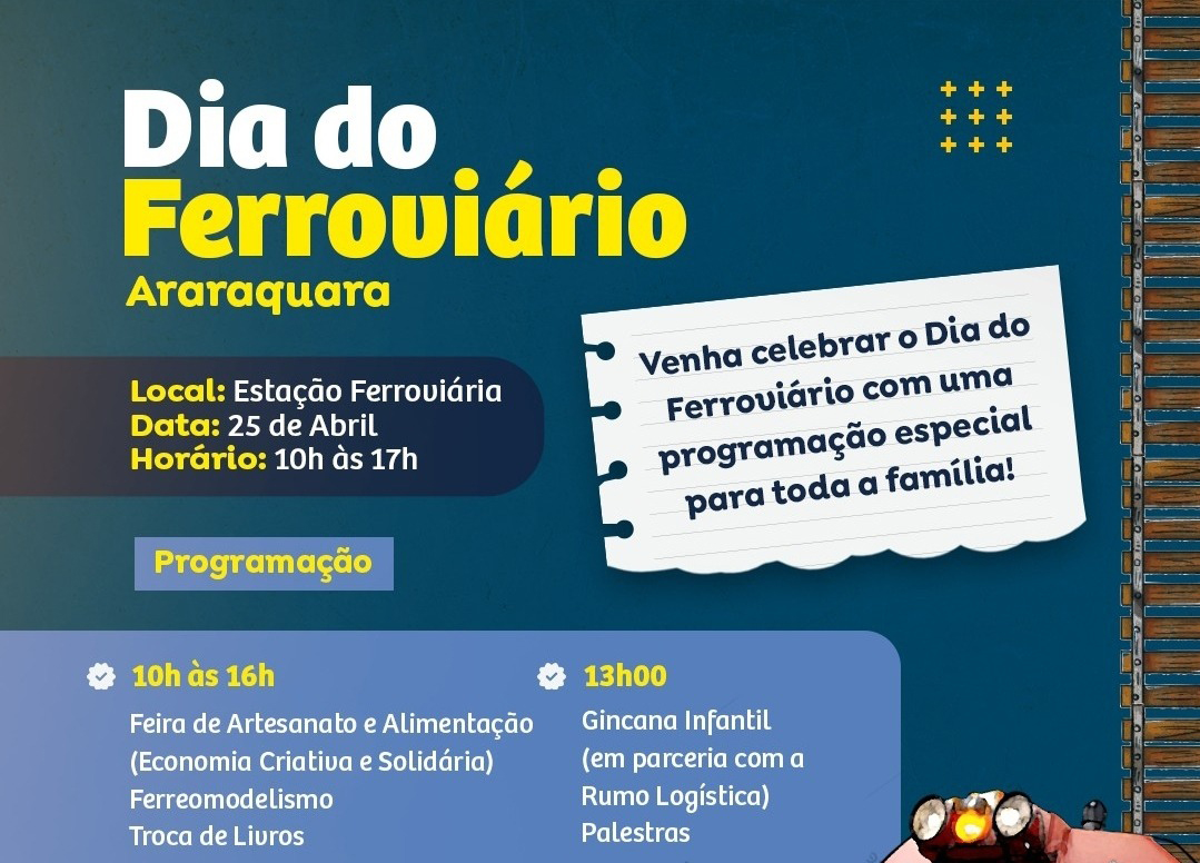 O Dia do Ferroviário está chegando! Uma festa comemorativa vem sendo produzida pela Secretaria Municipal de Cultura e Fundart em homenagem aos ferroviários de Araraquara. O evento gratuito será realizado neste sábado, 25 de abril, das 10h às 16 horas, no Museu Ferroviário Francisco Aureliano de Araújo, no centro da cidade.