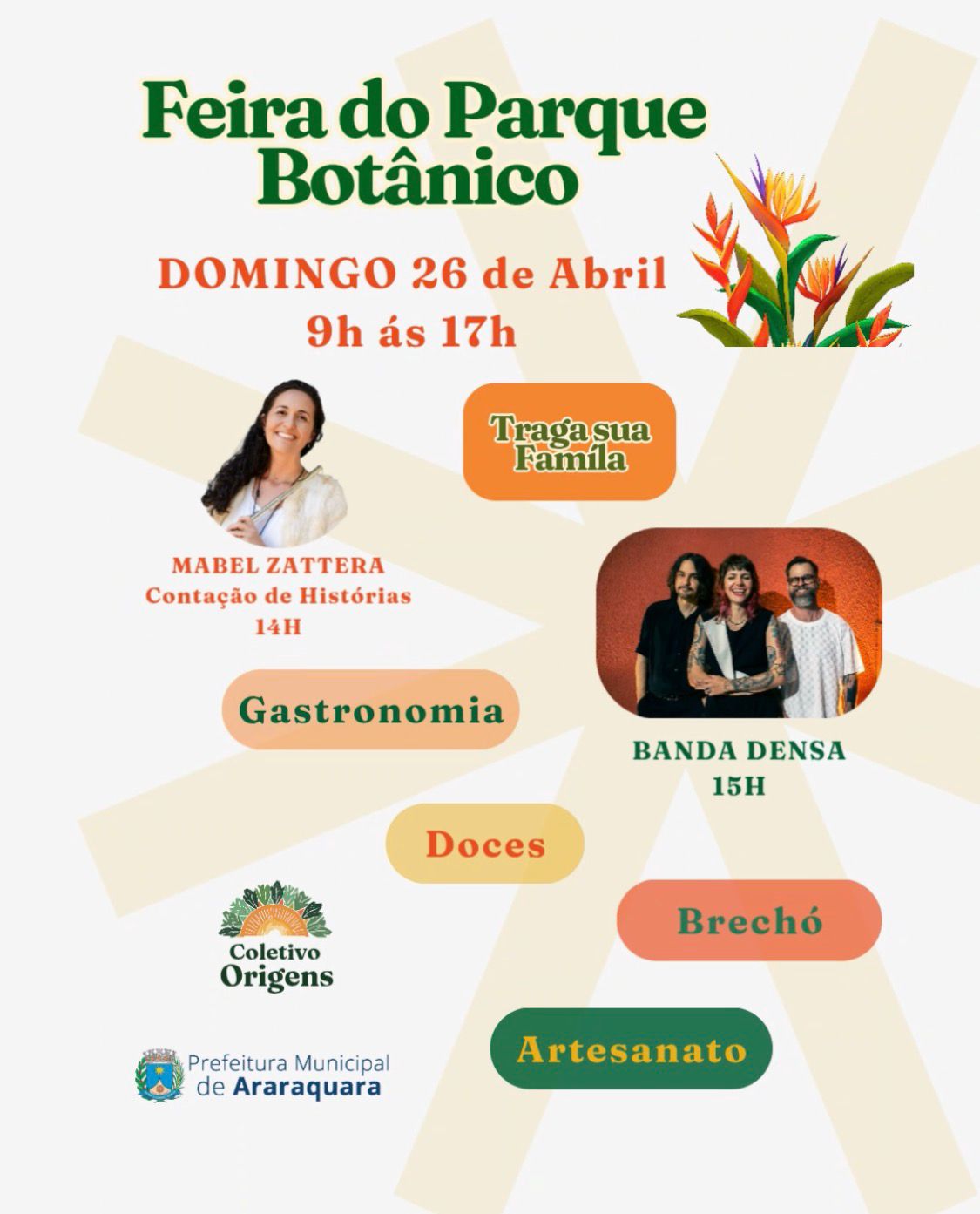 Neste domingo, 26 de abril, tem Feira do Parque Botânico, das 9h às 18h com expositores, lazer e atrações artísticas. A feira apresenta expositores de artesanato e gastronomia, além de contação de histórias e show musical no Parque do Botânico
