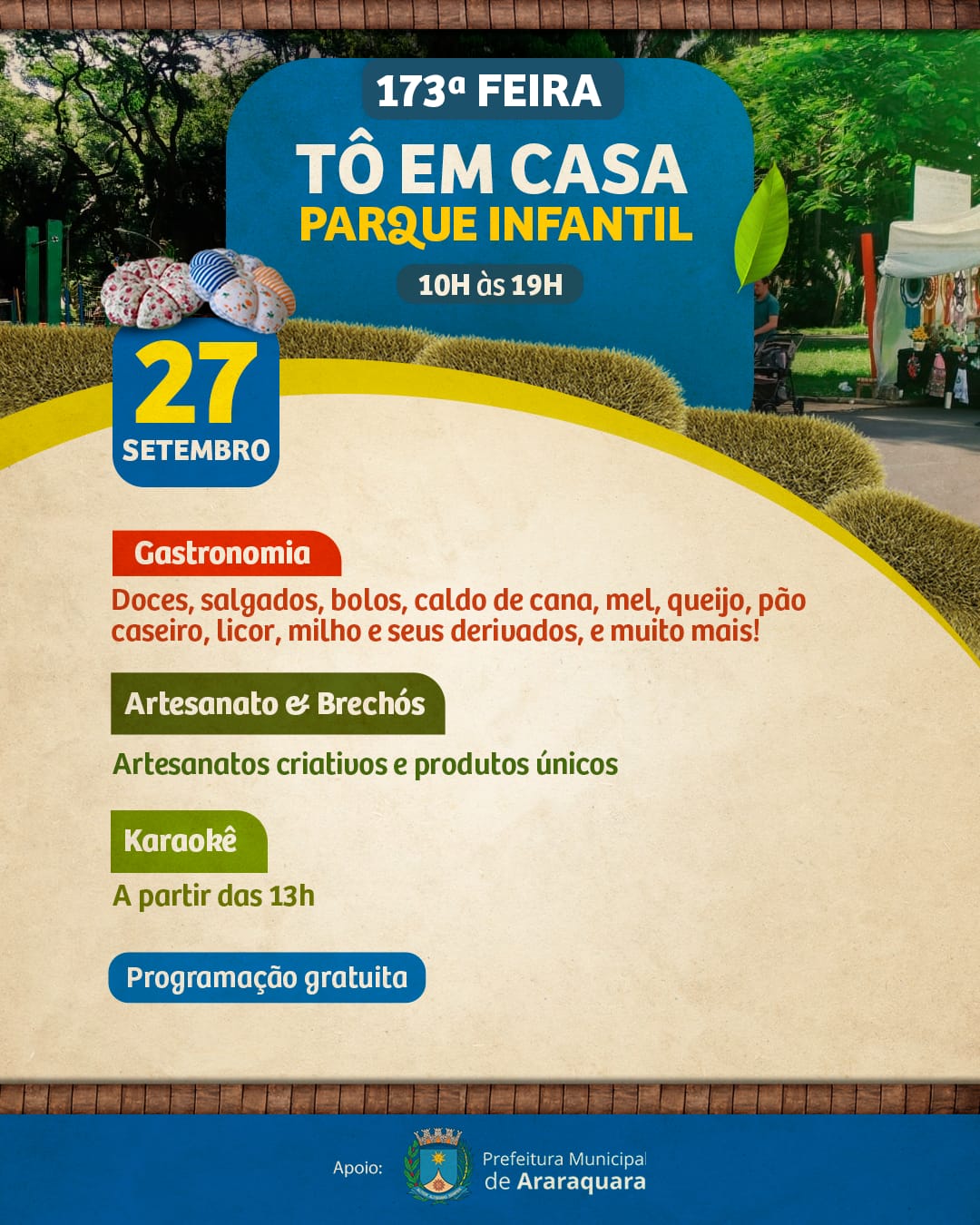 O Parque Infantil de Araraquara recebe neste sábado (27), das 10h às 19h, mais uma edição da Feira “Tô em Casa”. O evento reúne expositores de artesanato, brechós, bijuterias, brinquedos, além de opções variadas de gastronomia como doces, salgados, mel, queijos, milho e derivados.