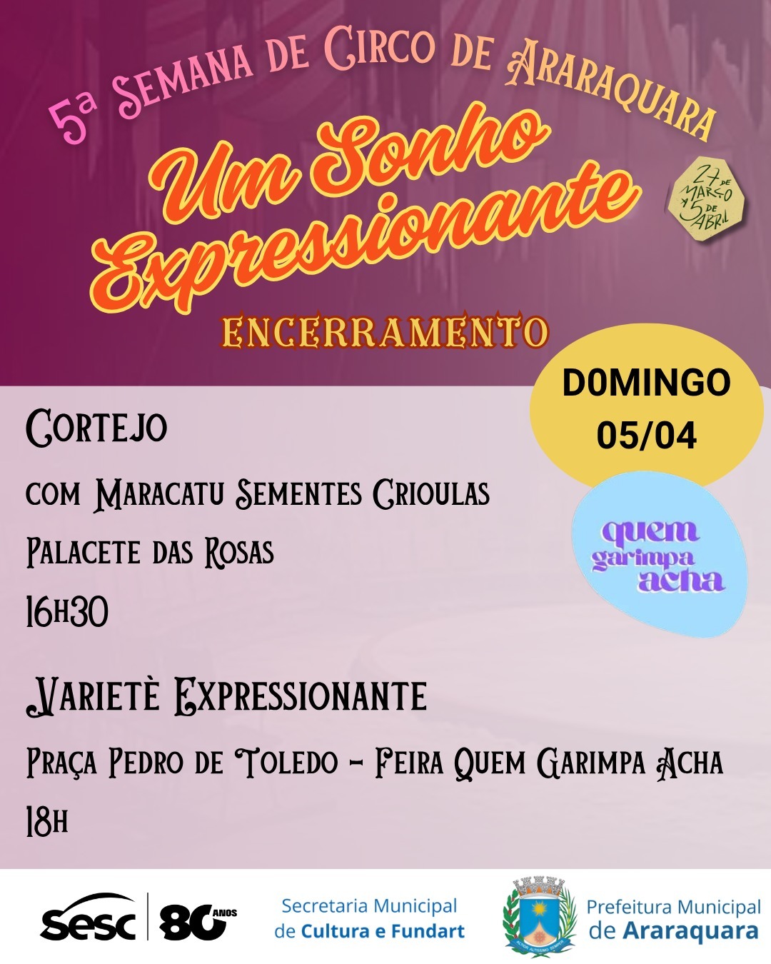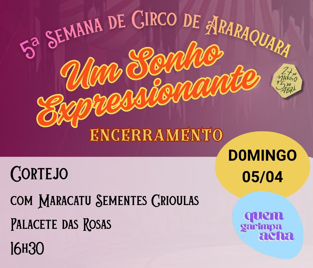 Neste domingo, 5 de abril, a 5ª Semana do Circo de Araraquara encerra a programação deste ano com um encontro a partir das 16h30, em frente ao Palacete das Rosas, sede da Secretaria Municipal de Cultura e Fundart (ao lado da Prefeitura).