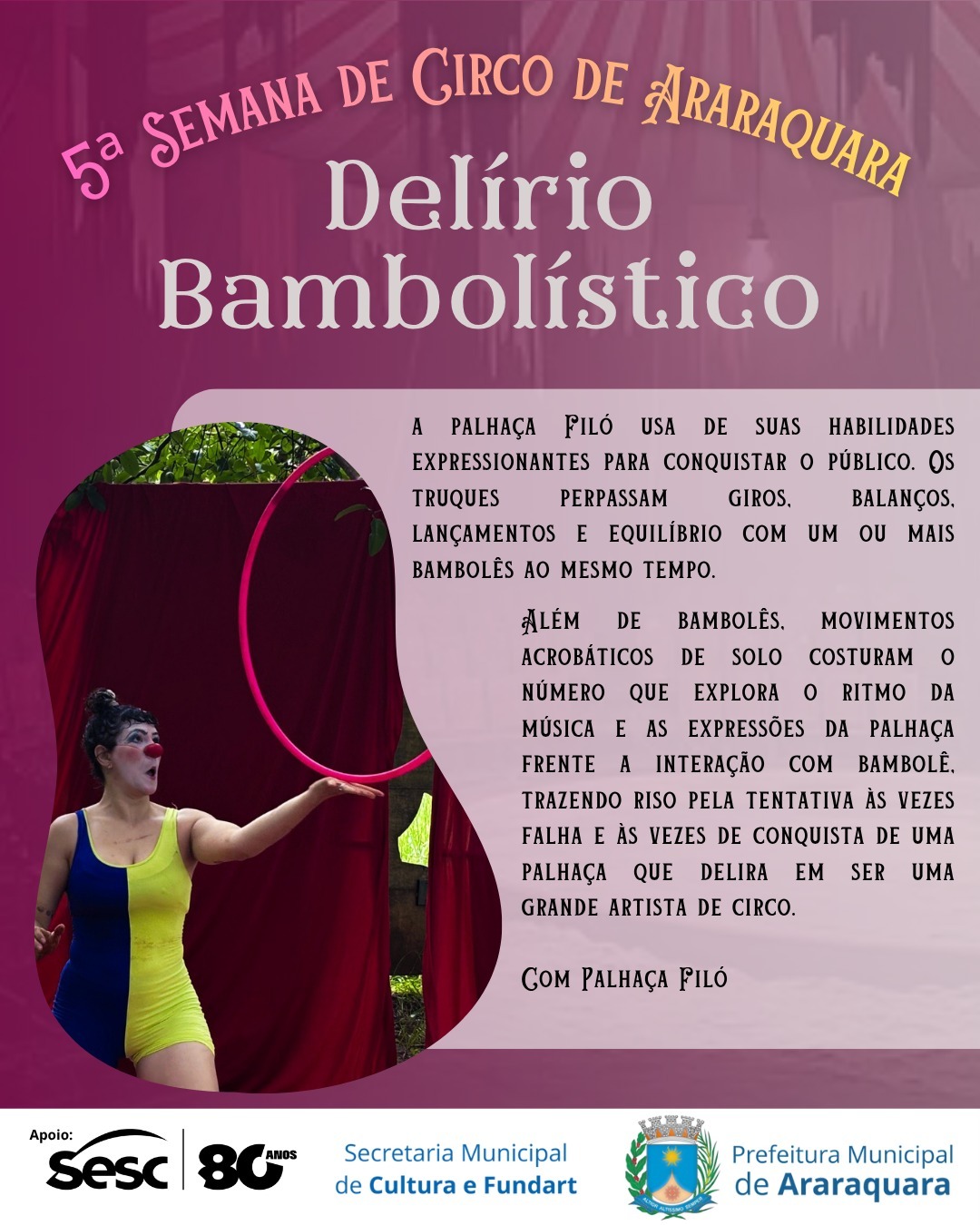 Na sequência, o solo “Delírio bambolístico”, interpretado pela Palhaça Filó (Bárbara Monteiro), aposta na leveza e no humor. Com classificação livre, o número trabalha bambolês em giros, lançamentos e equilíbrios, combinados a movimentos acrobáticos de solo. A construção segue o ritmo da música e o jogo cênico da palhaça, que alterna momentos de fracasso e conquista. É dessa oscilação que nasce o riso e a identificação com o público.