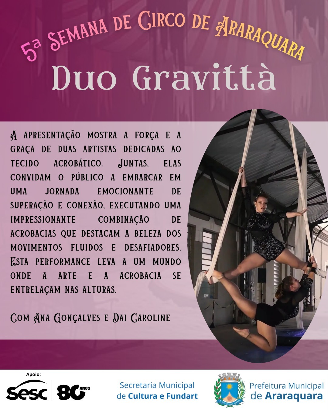 A programação segue com o Duo Gravittà no tecido acrobático, conduzindo o público a uma experiência marcada pela força e pela delicadeza. Suspensas nas alturas, as artistas executam movimentos fluidos e desafiadores, construindo uma narrativa de conexão. A coreografia destaca a precisão técnica e a beleza estética do tecido, em uma apresentação com impacto visual.