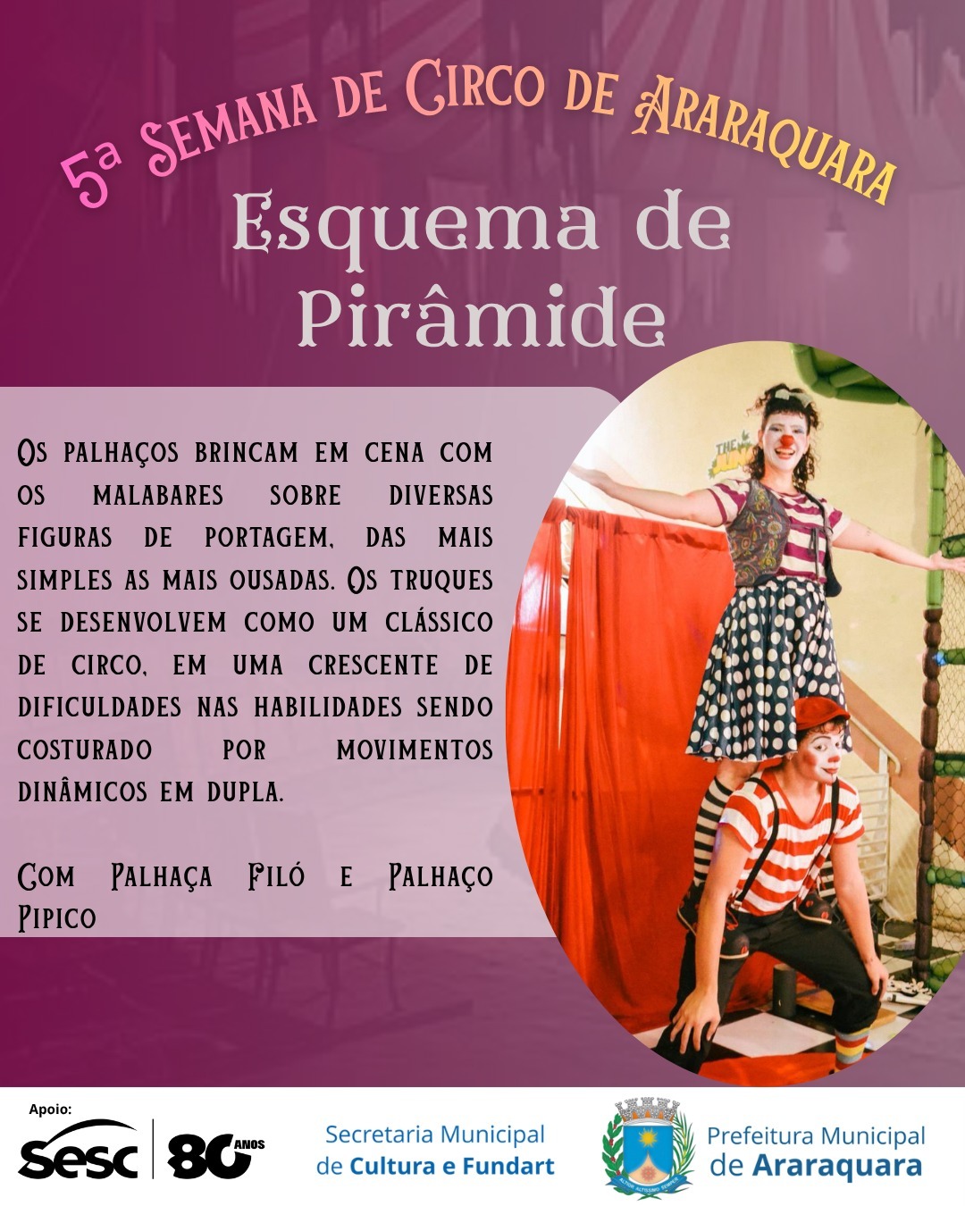 Encerrando a sequência de números, o Duo Dengo apresenta “Esquema de Pirâmide”, um número que combina palhaçaria, portagem e malabarismo. A dupla – formada por Palhaça Filó e Palhaço Pipico – desenvolve suas habilidades em uma crescente de complexidade, passando por figuras simples até formações mais ousadas. Os truques se desenvolvem como um clássico de circo, em uma crescente de dificuldades nas habilidades sendo costurado por movimentos dinâmicos em dupla. O número termina com malabares na segunda altura.