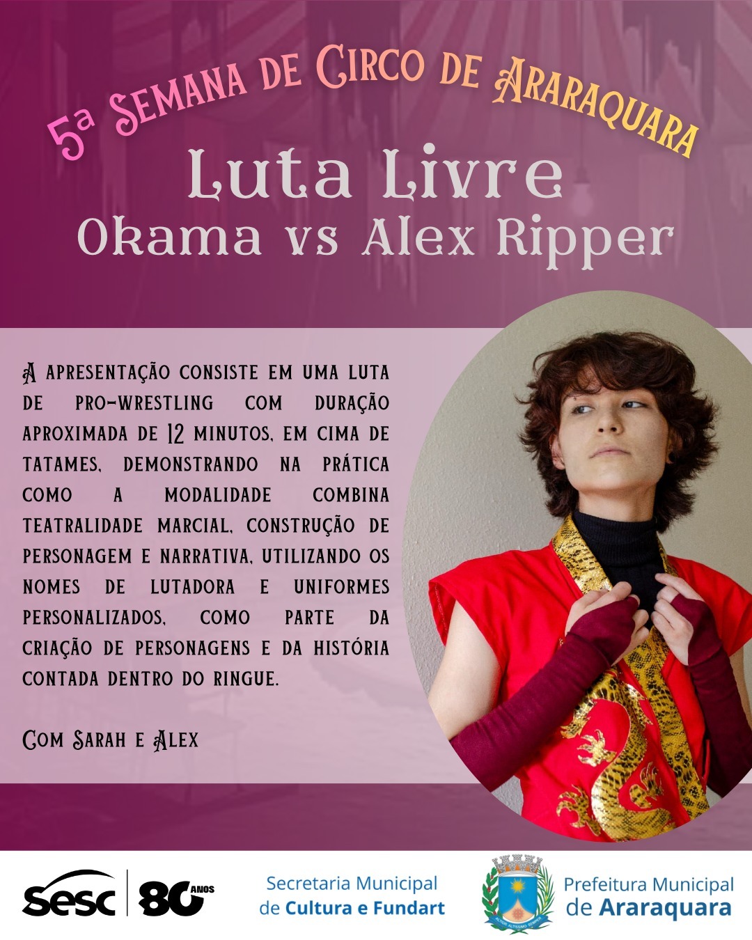 A abertura traz a energia da luta livre em um formato inspirado no pro-wrestling, com Okama vs Alex Ripperindo indo além do embate físico e evidenciando o caráter teatral da modalidade. A narrativa se desenrola sobre tatames, combinando gestual marcial e encenação dos personagens construídos a partir de nomes e figurinos personalizados. O resultado é um espetáculo que mistura esporte, dramaturgia e entretenimento, revelando a luta como linguagem artística.