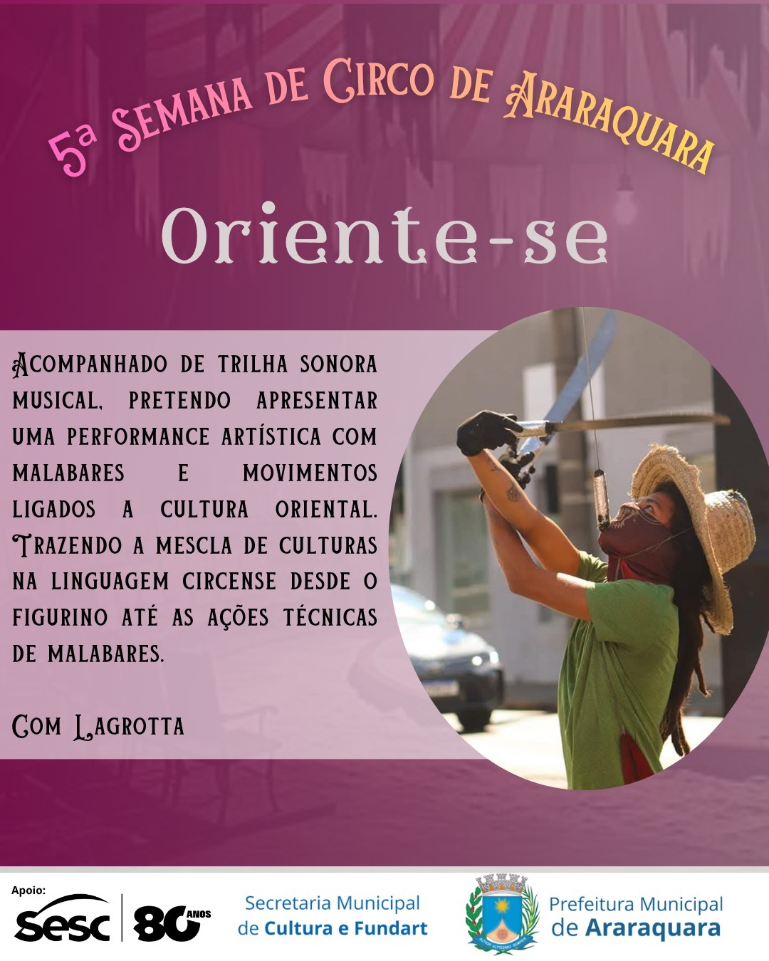 O número “Oriente-se”, de Lagrotta, apresenta uma estética inspirada em referências orientais. A performance utiliza três facões e três tochas de fogo, integrando malabarismo e movimentos corporais em uma composição visual marcada pela trilha sonora e pelo figurino. A proposta enfatiza o diálogo entre culturas dentro da linguagem circense, criando uma atmosfera que combina técnica, risco e expressividade.
