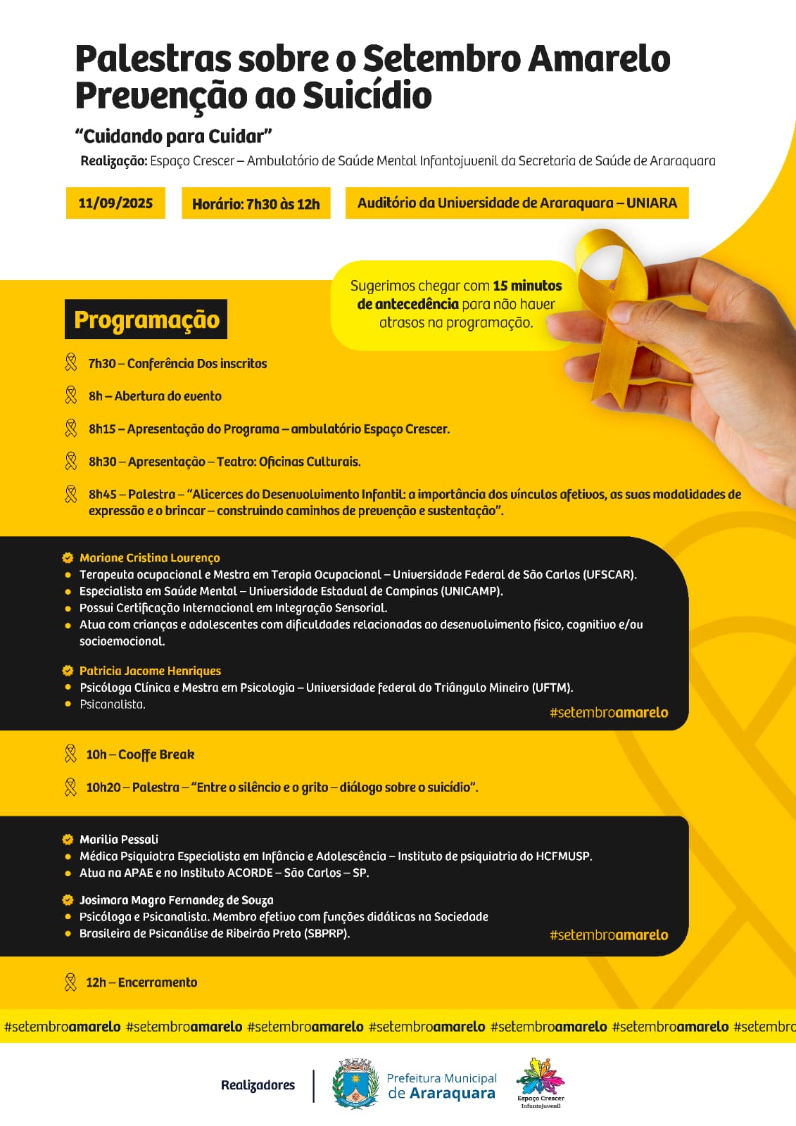 Inscrições: https://araraquara.sp.gov.br/setembro-amarelo-cuidando-para-cuidar