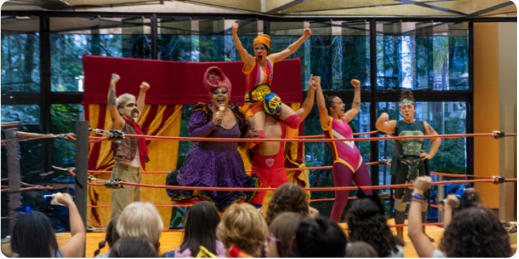 Misturando linguagem circense, teatralidade e improviso, o espetáculo recria um “ringue teatral” cheio de surpresas, onde a comicidade e a interação com o público são fundamentais.