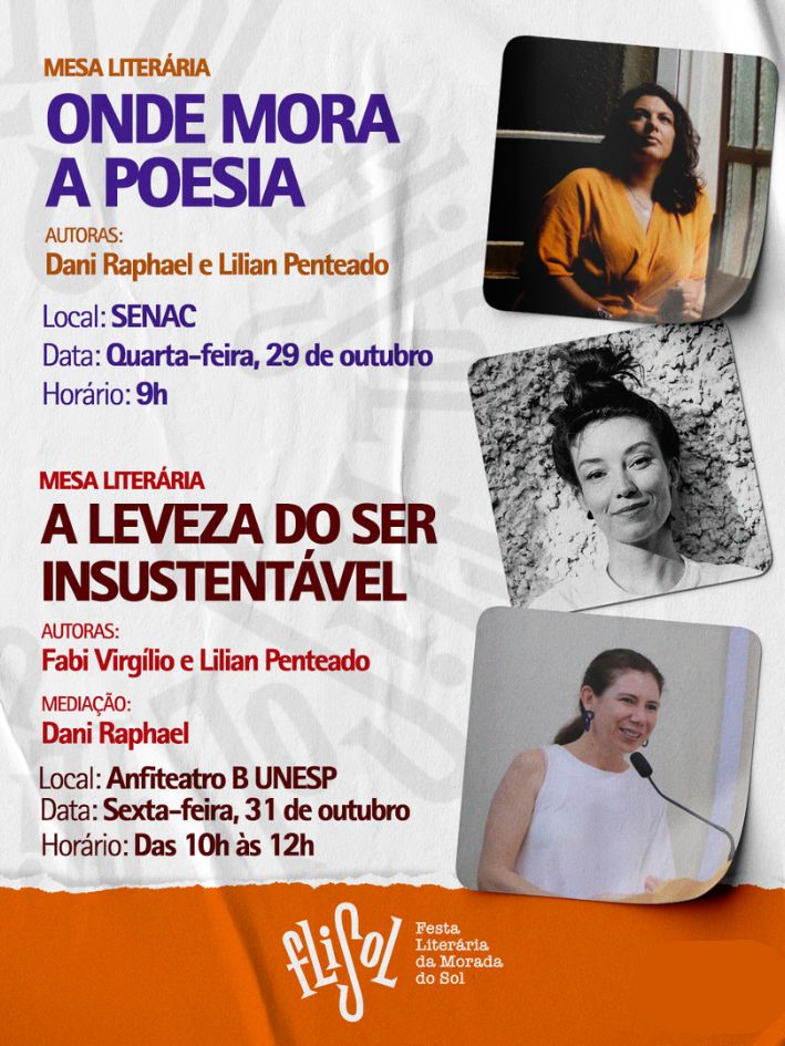 Já Dani Raphael é escritora, artista multifacetada e curadora da própria FliSol; é autora de Renascer em Mim (Editora Brunsmark), Lilith em Escorpião (Editora Floresça), adaptado para o teatro, e Pé de Romã (Editora Opera), obra que inspirou o filme homônimo com estreia prevista para este segundo semestre de 2025. Também publicou e-books de poesia como Pra Ela e Dela e transita entre literatura, música e artes cênicas com uma escrita intensa e profundamente humana.