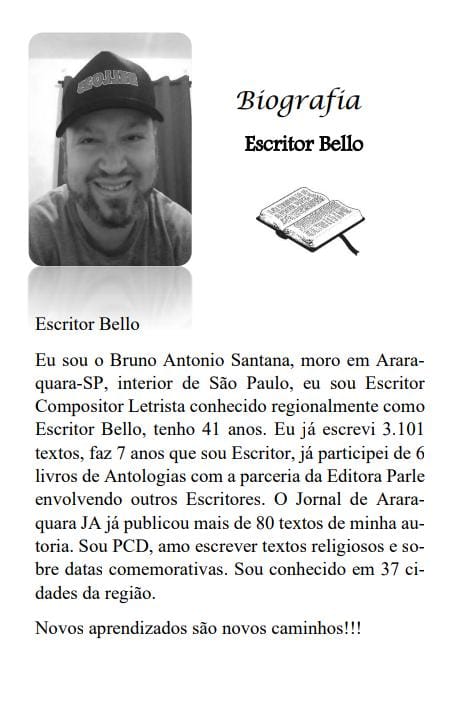 Eu sou o Bruno Antonio Santana, moro em Araraquara-SP, interior de São Paulo, eu sou Escritor Compositor Letrista conhecido regionalmente como Escritor Bello, tenho 41 anos. Eu já escrevi 3.101 textos, faz 7 anos que sou Escritor, já participei de 6 livros de Antologias com a parceria da Editora Parle envolvendo outros Escritores. O Jornal de Araraquara JA já publicou mais de 80 textos de minha autoria. Sou PCD, amo escrever textos religiosos e sobre datas comemorativas. Sou conhecido em 37 cidades da região.